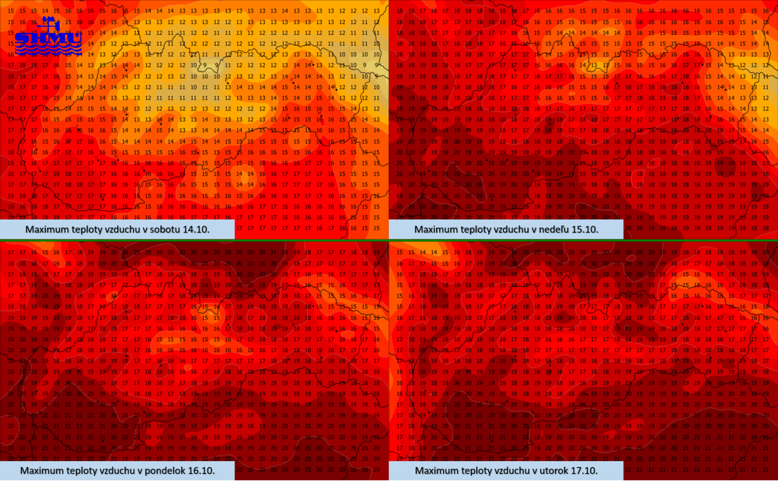 Obr. 2: Maximálna denná teplota vzduchu na území Slovenska v dňoch 14. až 17.10.2017