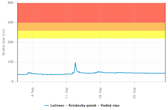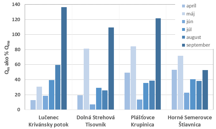 Samotná hydrologická situácia na prítokoch však taká dramatická nebola (obr. 1). Rozdiely vo vodnosti tokov je možné vysvetliť nerovnomerným rozložením zrážok na povodie. Relatívne viacej ich spadlo vo východnej polovici územia. Prítoky s relatívne malou plochou povodia, v tomto konkrétnom prípade 200-300 km2 k vodomerným profilom, citlivo reagovali na príčinnú zrážku – rýchly vzostup a následne aj pokles vodnej hladiny po skončení dažďa. No vzostup vodnej hladiny nebol taký významný, aby sa prejavil aj na hlavnom toku. Najvýznamnejšia kulminácia na vybraných prítokoch v septembri bola na Krivánskom potoku v Lučenci na úrovni 10-denného prietoku. Septembrový maximálny prietok v Dolnej Strehovej na Tisovníku ovplyvnilo vypúšťanie vôd z termálneho kúpaliska v Dolnej Strehovej.