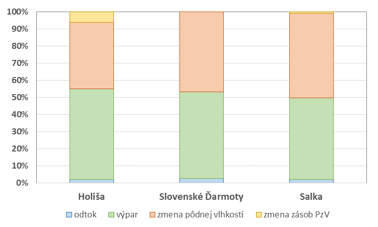 Na obr. 3 sú znázornené namodelované relatívne hodnoty jednotlivých členov hydrologickej bilancie v mesačnom kroku pre povodia s uzáverovými profilmi v hydroprognóznych staniciach. Hodnota 100 % je mesačný úhrn zrážok na povodie.