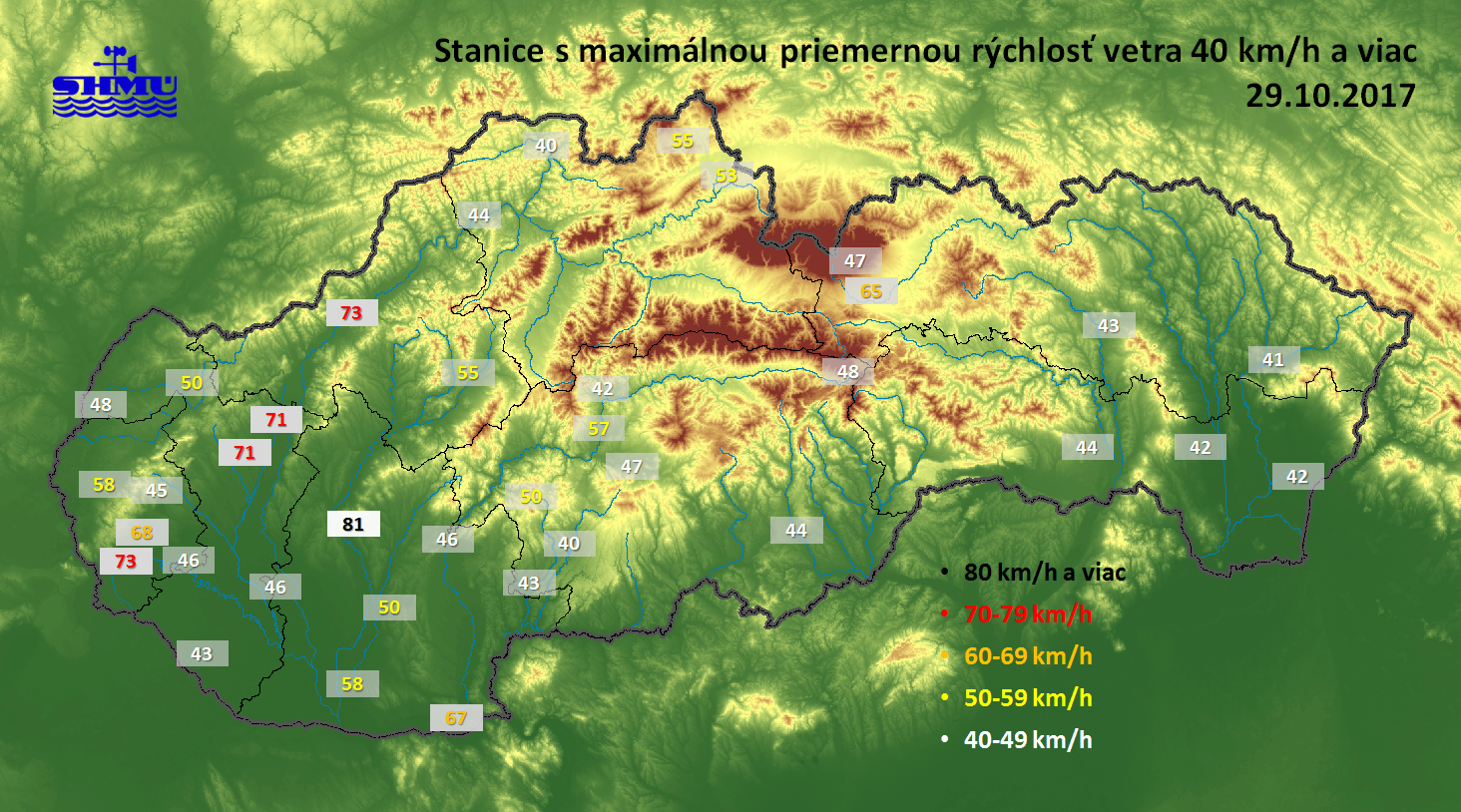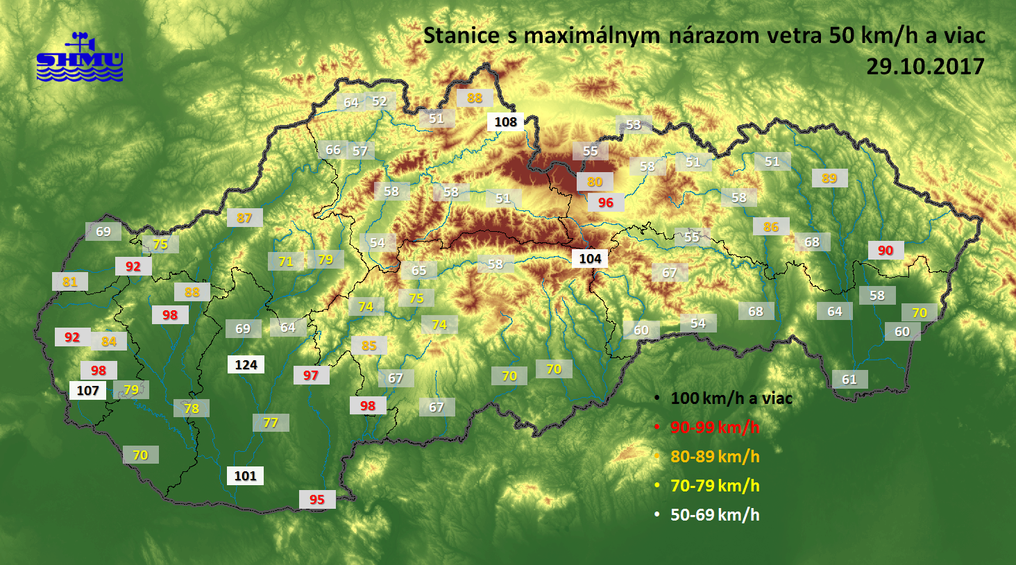 V nedeľu 29. októbra 2017 sa na našom území vyskytol extrémne silný vietor, ktorý spôsobil rozsiahle škody predovšetkým na západe a severe nášho územia. Už niekoľko dní pred udalosťou sme o nej informovali prostredníctvom našich textových predpovedí, či podrobnejších analýz (TU, či TU). V obrázkoch nižšie prinášame prehľad najsilnejších nárazov vetra a priemernej rýchlosti vetra, ktoré sme namerali na našich klimatologických a automatických staniciach. Nárazy cez 100 km/h sme zaznamenali vo Veľkých Janíkovciach, v Bratislave na letisku a v Mlynskej Doline, v Telgárte a Hurbanove. Priemerná rýchlosť vetra dosiahla vo Veľkých Janíkovciach silu víchrice (75 - 88 km/h), búrlivý vietor (62 - 74 km/h) bol na staniciach Bratislava letisko, Trenčín, Piešťany, Jaslovské Bohunice, Slovenský Grob, Mužla a Poprad.