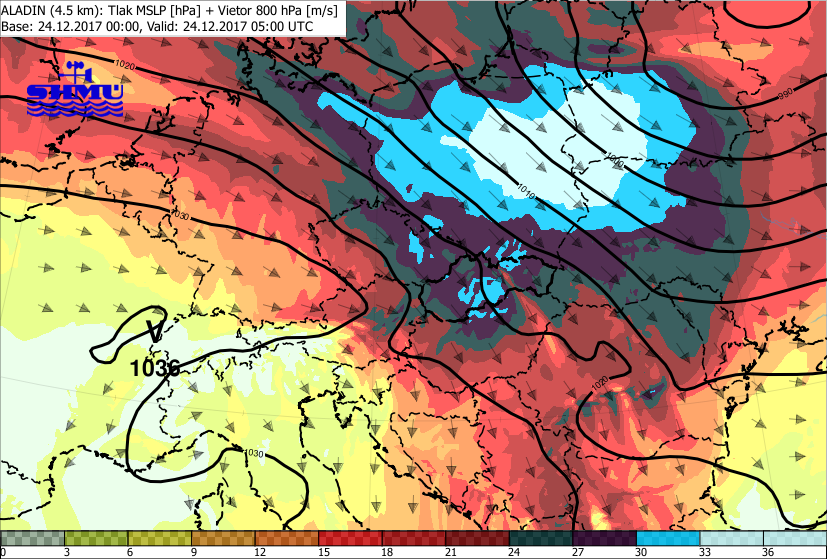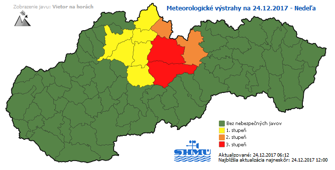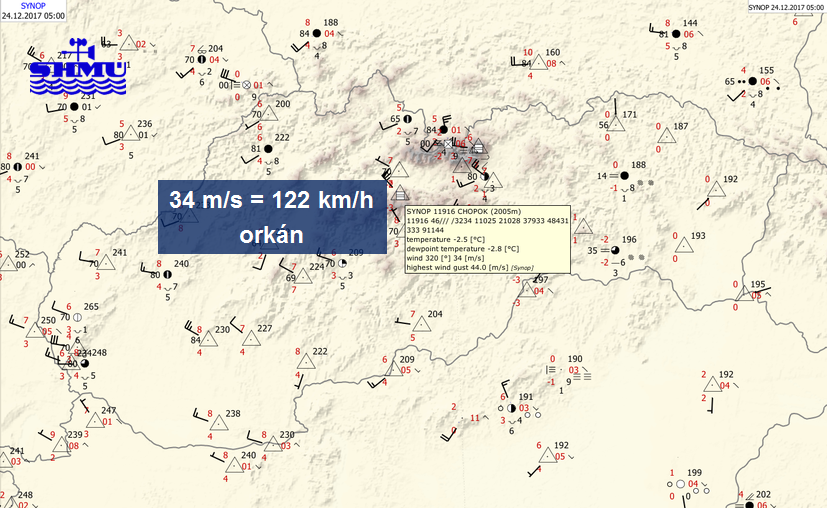 Na Štedrý deň po prechode teplého frontu prúdi nad naše územie od západu až severozápadu teplý vzduch. V súvislosti s ním sme na horách namerali aj veľmi silný vietor, ktorý dosiahol na hrebeni Nízkych Tatier až silu orkánu (teda priemernú rýchlosť nad 118 km/h). Na stanici Chopok sme ráno namerali priemernú rýchlosť vetra až 122 km/h (s maximálnym nárazom vetra 158 km/h). V decembri 2017 je to už druhý deň s takto silným vetrom (prvý bol 10. decembra).