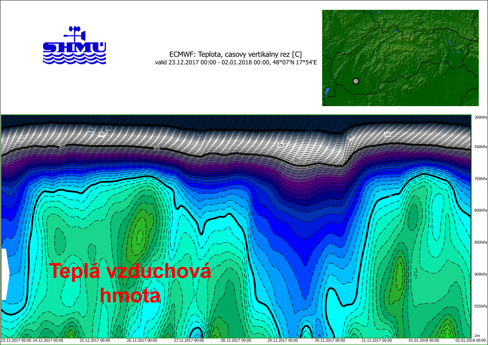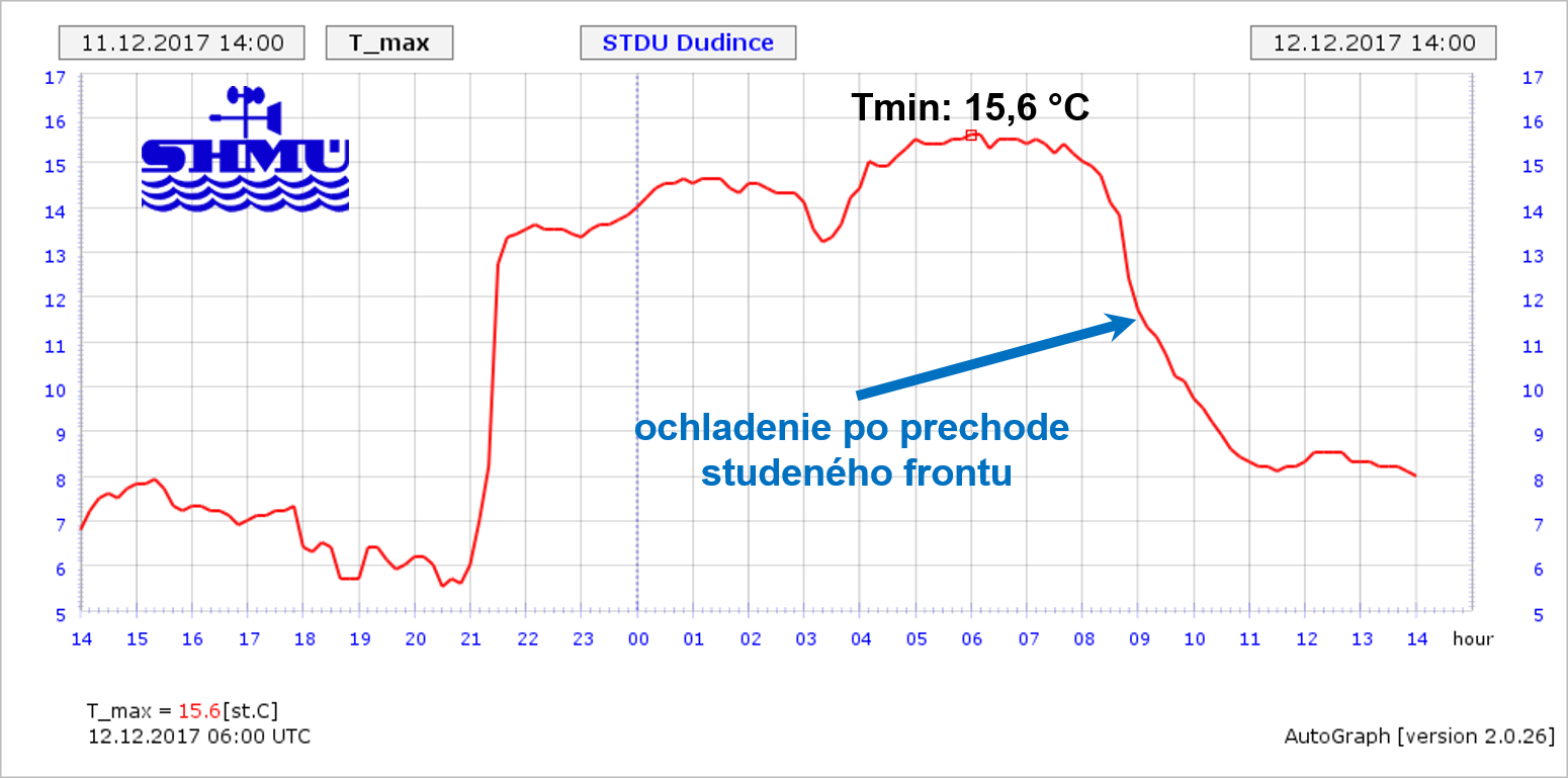 Výrazné oteplenie sprevádzané aj silným vetrom, ktoré nasledovalo po chladnejších dňoch na začiatku decembra 2017, spôsobilo rýchle roztopenie snehovej pokrývky v nižších polohách na viacerých miestach Slovenska. Výnimkou bol Banskobystrický kraj, kde bol vďaka orograficky zložitému terénu v nižších polohách väčšinou len slabý vietor a pretrvávala inverzia teploty vzduchu. V prvej polovici decembra sme najvýraznejšiu kladnú odchýlku priemernej dennej teploty vzduchu od dlhodobého priemeru zaznamenali na začiatku druhej decembrovej dekády. Najteplejšie bolo v dňoch 11. až 13.12., pričom išlo o najteplejšie obdobie v decembri 2017. Maximálna denná teplota vzduchu dňa 12.12.2017 presiahla ojedinele 15 °C (Dudince 15,4 °C; Topoľčany 15,1 °C). Zaujímavosťou je, že maximum teploty vzduchu bolo na spomínaných staniciach dosiahnuté už v ranných hodinách. Na stanici v Rimavskej Sobote a v Revúcej v juhovýchodnej časti Banskobystrického kraja bolo v spomínaný deň maximum teploty len zhruba 3 °C nad nulou a stále sa tu nachádzala aj súvislá snehová pokrývka!