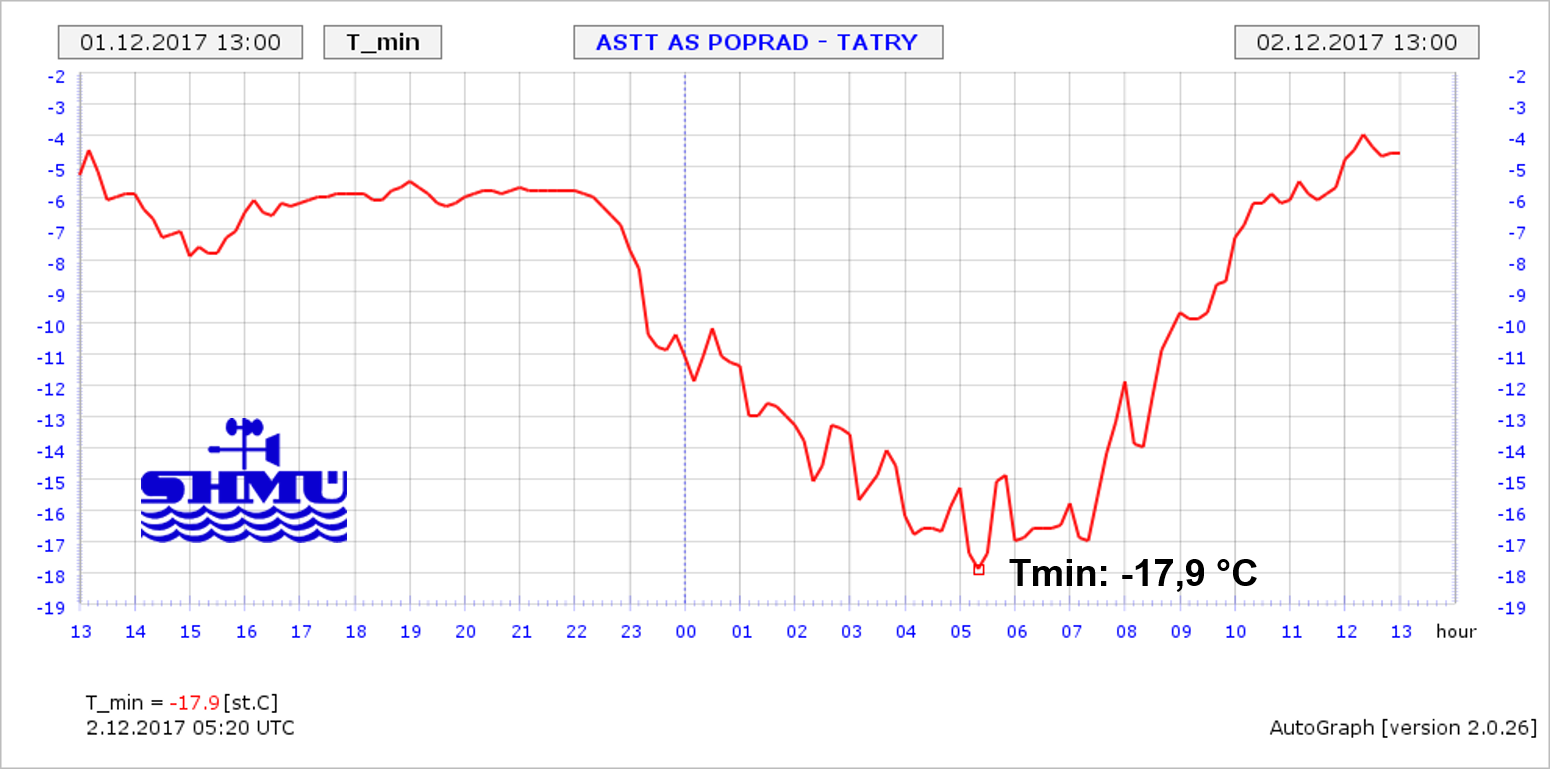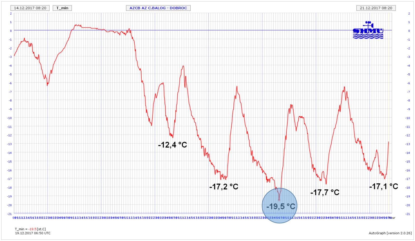 Po týchto veľmi teplých dňoch k nám od severozápadu dvakrát prúdil chladný morský vzduch (najprv 13. a 14.12., potom v závere druhej a na začiatku tretej decembrovej dekády od 16. do 21.12.). Druhé spomínané ochladenie bolo výraznejšie, pričom v dolinách a kotlinách klesala teplota vzduchu ojedinele opäť pod -15 °C. Najchladnejšie ráno sme dňa 19.12.2017 zaznamenali v Čiernom Balogu, s minimálnou teplotou až -19,5 °C. Táto hodnota však opäť výrazne zaostala za absolútnym rekordom minimálnej dennej teploty vzduchu pre 19. december. Podľa dostupných údajov to však bola zatiaľ najnižšia teplota vzduchu nameraná na území Slovenska v decembri v roku 2017.
