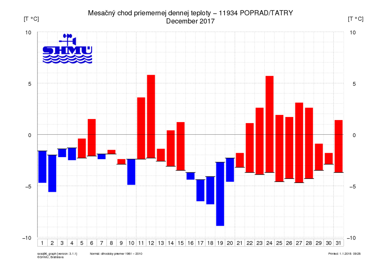 V prvých dňoch decembra k nám od západu zasahoval v chladnom vzduchu výbežok tlakovej výše. Po zmenšení oblačnosti a zoslabnutí vetra klesala teplota vzduchu v dolinách a kotlinách ojedinele aj pod -15 °C. Najchladnejšie ráno tohto obdobia bolo 2.12. kedy sa v Poprade na letisku ochladilo na -17,0 °C (údaj z minimálneho teplomera zaslaný pozorovateľom), avšak do rekordne nízkej hodnoty z roku 1969 chýbalo na tejto stanici ešte pomerne veľa, presne 6,5 °C.  Maximálna denná teplota vzduchu bola na našom území zväčša do +6 °C. Priemerná denná teplota vzduchu počas prvých piatich decembrových dní bola na území Slovenska väčšinou pod dlhodobým priemerom rokov 1981 - 2010 (obr. 3). Na obrázku č. 3 môžete vidieť chod priemernej dennej teploty vzduchu v Hurbanove a jej odchýlky od dlhodobého priemeru rokov 1981 - 2010 počas celého hodnoteného mesiaca. Pre zaujímavosť si môžete pozrieť aj chod priemernej dennej teploty vzduchu v decembri na ďalších vybraných staniciach: Bratislava - letisko, Dolný Hričov, Sliač, Boľkovce, Poprad, Kamenica nad Cirochou (na poslednej stanici sú odchýlky od DP 1961 - 1990). Z grafu na obrázku č. 3, ale aj z ďalších priložených grafov, je možné identifikovať dve obdobia kedy bola priemerná denná teplota vzduchu pod dlhodobým priemerom (na začiatku decembra a na prelome druhej a tretej decembrovej dekády), ale rovnako tiež dve obdobia s priemernou dennou teplotu vzduchu nad dlhodobým priemerom (prvé obdobie trvalo zhruba od 5. do 15.12. a druhé od 21., na niektorých staniciach od 23.12., až do konca roka).