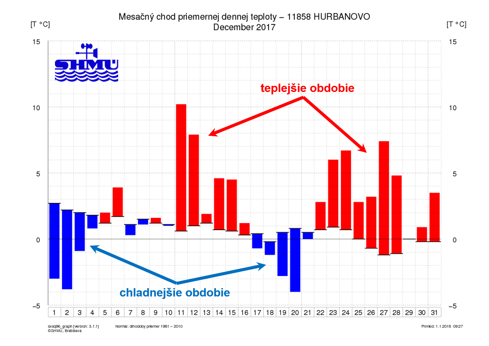 Obr. 3: Priebeh priemernej dennej teploty vzduchu a jej odchýlka od dlhodobého priemeru rokov 1981 - 2010 v Hurbanove v decembri 2017.
