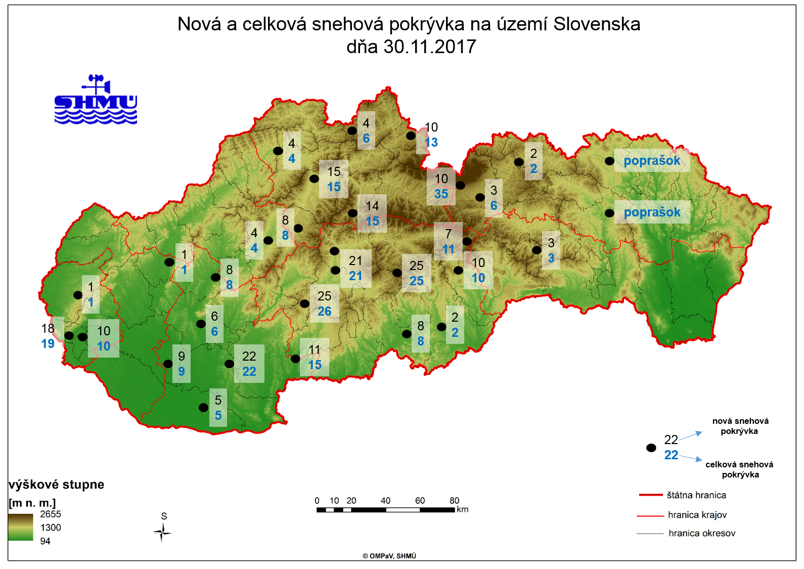 Obr. 2: Nová a celková výška snehovej pokrývky na území Slovenska dňa 30.11.2017 (o 7:00 SEČ).