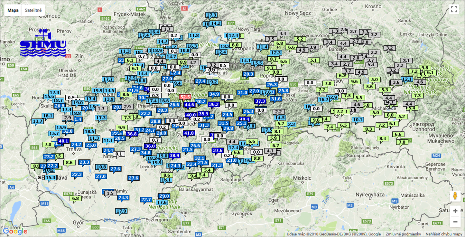 Obr. 4: 24-hodinový úhrn zrážok na území Slovenska dňa 29.12.2017 (do 06:00 SEČ).