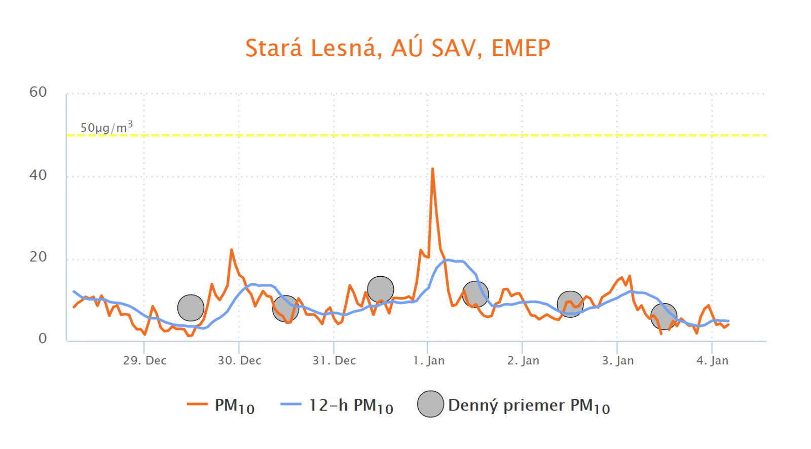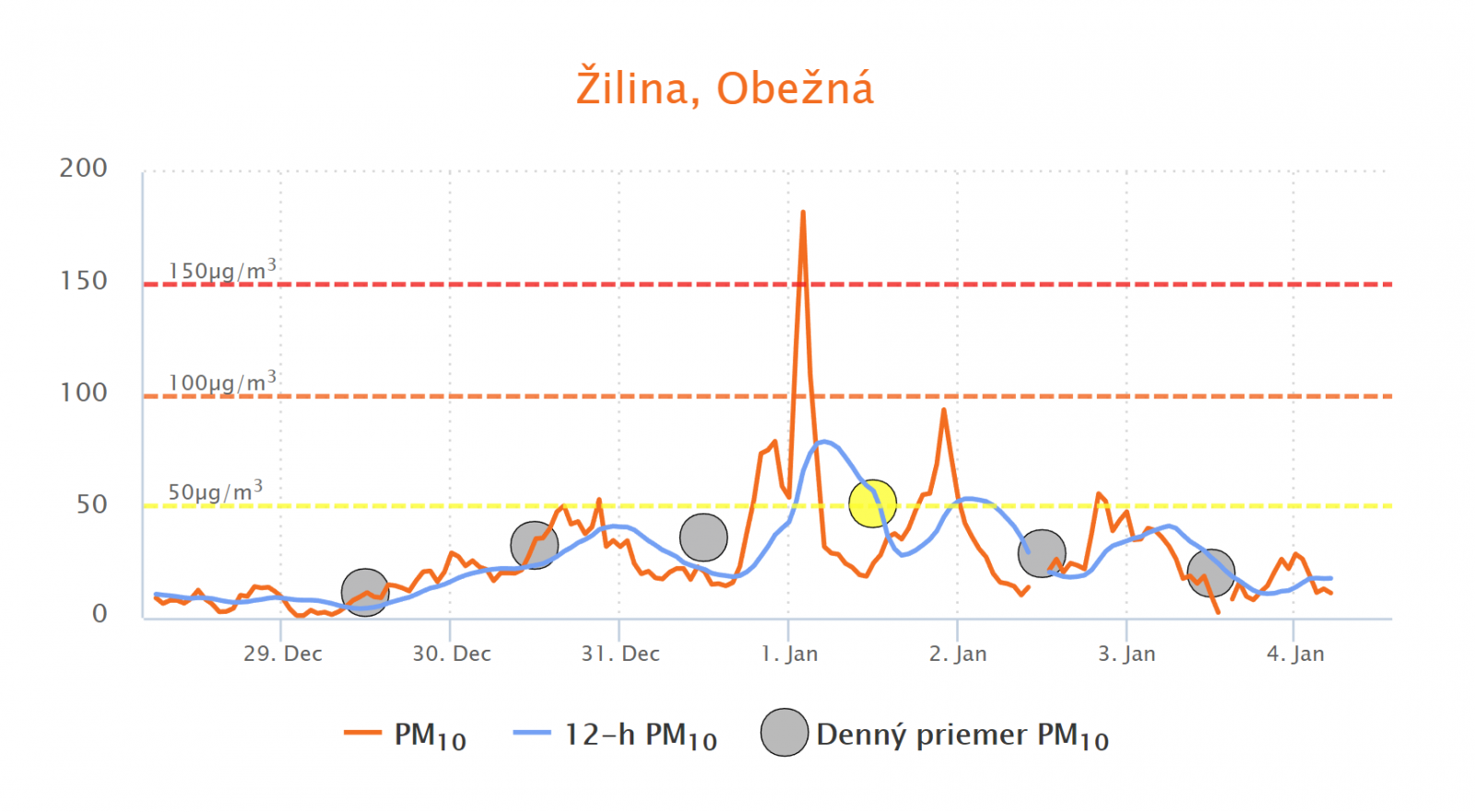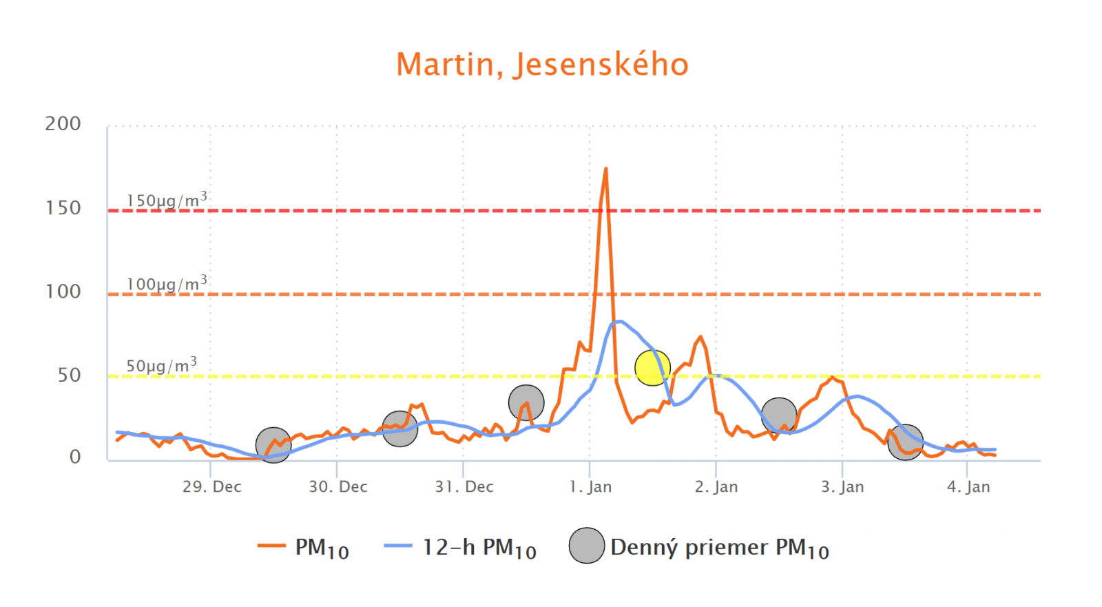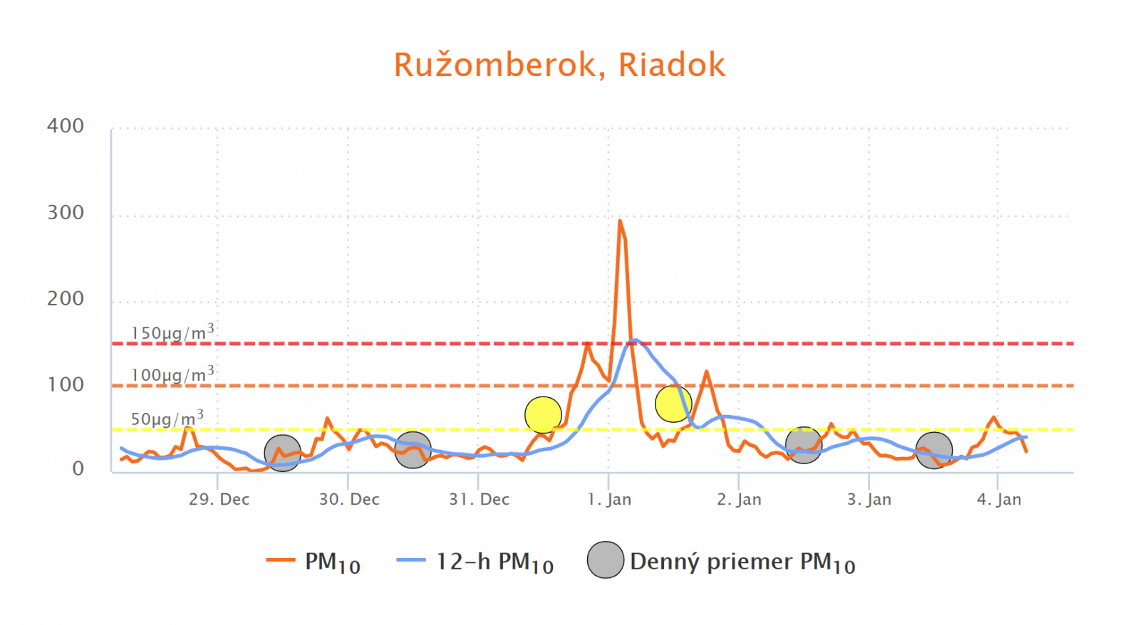 Vysvetlivky: Oranžová krivka - priemerné hodinové koncentrácie, modrá čiara - 12-hodinový klzavý priemer, krúžok - denný priemer (krúžok je žltý, ak je priemenrá denná koncentrácia PM10 vyššia ako 50 µg.m-3). Oranžová, resp. červená čiarkovaná čiara - informačný, resp. výstražný prah pre vyhlásenie smogovej situácie.