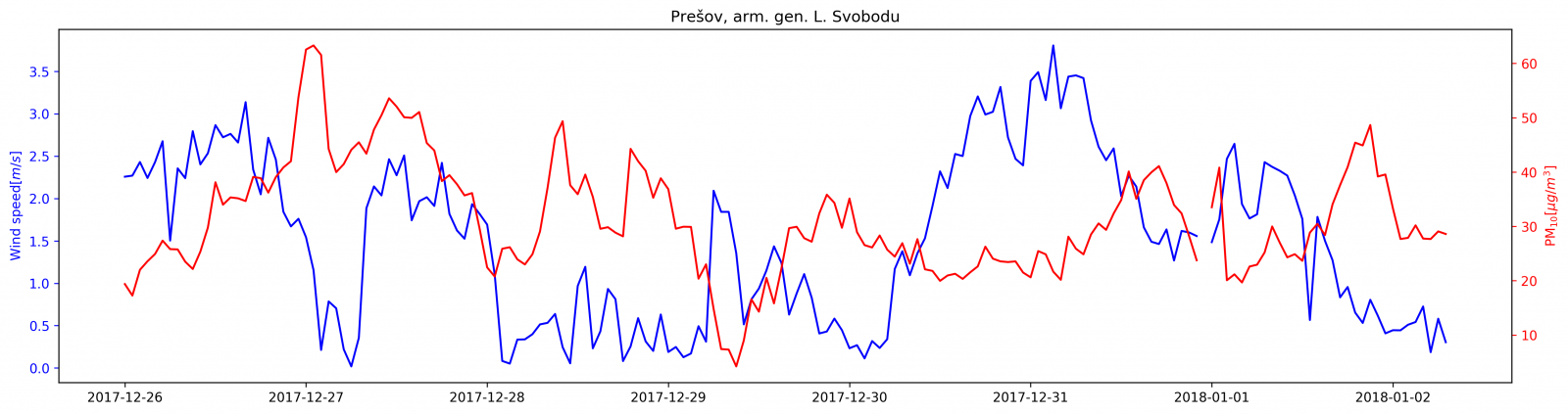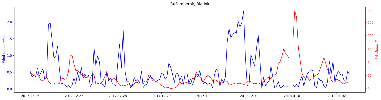 Obr. 2. Priebeh koncentrácií PM10 (červená krivka) a rýchlosti vetra v 5 m (modrá krivka) na monitorovacej stanici Prešov, arm. gen. L. Svobodu (horný panel) a Ružomberok, Riadok (spodný panel).
