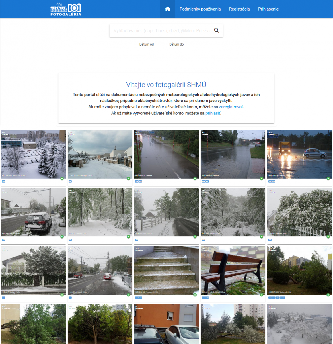 Milí fanúšikovia. Pod záštitou Slovenskej meteorologickej spoločnosti vám SHMÚ ponúka možnosť podieľať sa na tvorbe databázy nebezpečných meteorologických a hydrologických javov na území Slovenska. Na adrese http://foto.shmu.sk (alebo na stránke SHMÚ vpravo na hlavnej lište meteorologického spravodajstva) je pripravená galéria, ktorú chceme s vašou pomocou napĺňať fotografiami týchto javov a ich následkov. Po registrácii je do galérie možné pridávať aj fotografie historických udalostí, no je nutné, aby boli autorské, prípadne so súhlasom autora (podmienky používania). Môžete prispieť fotografiami nielen škôd spôsobených danými udalosťami, ale aj ďalších sprievodných javov (napr. pri krupobití okrem škôd na majetku aj samotné krúpy či oblačné štruktúry; pri škodách spôsobených snehom (polámané stromy, preborené strechy...) aj výšku snehovej pokrývky; atď.). K jednotlivým fotografiám je potrebné pridať aspoň jednu spomedzi značiek (tagov), ktorá určí základný popis javu, podľa čoho ich bude možné neskôr vyhľadávať. Značky nie možné zvoliť ľubovoľne, užívatelia majú k dispozícii len nasledovné: búrka, blesk, dážď, krúpy, povodeň, vietor, mráz, mrznúci dážď, sneh a sucho. K jednotlivým fotografiám je možné pridať podrobnejší popis udalosti, pripojiť odkaz na dokumentačný článok alebo video, ako aj upraviť meta údaje. Každý príspevok bude posudzovaný jedným z administrátorov a zverejnený až po jeho schválení, prípadne zamietnutý s odôvodnením. Administrátori môžu k fotografiám pridať aj ďalšie značky, ktoré užívatelia k dispozícii nemajú.