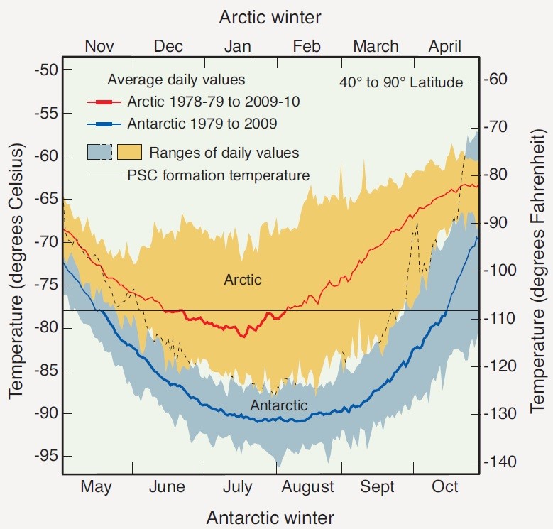 Stratosféra sa nad Antarktídou počas polárnej noci ochladzuje na oveľa nižšie teploty ako je tomu v prípade Arktídy. Preto je na úbytok ozónu citlivá omnoho viac Antarktída ako Arktída. Jasne to dokumentuje nasledujúci obrázok.