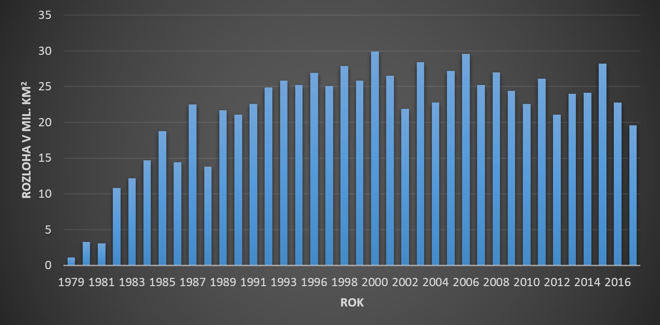 Obr. 3: Maximálna ročná rozloha ozónovej diery nad Antarktídou od roku 1979 do roku 2017. [5]