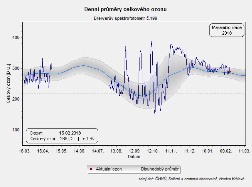 Obr. 4: Vývoj celkového atmosférického ozónu na stanici Marambio za posledný rok doplnený o dlhodobí priemer. [6]