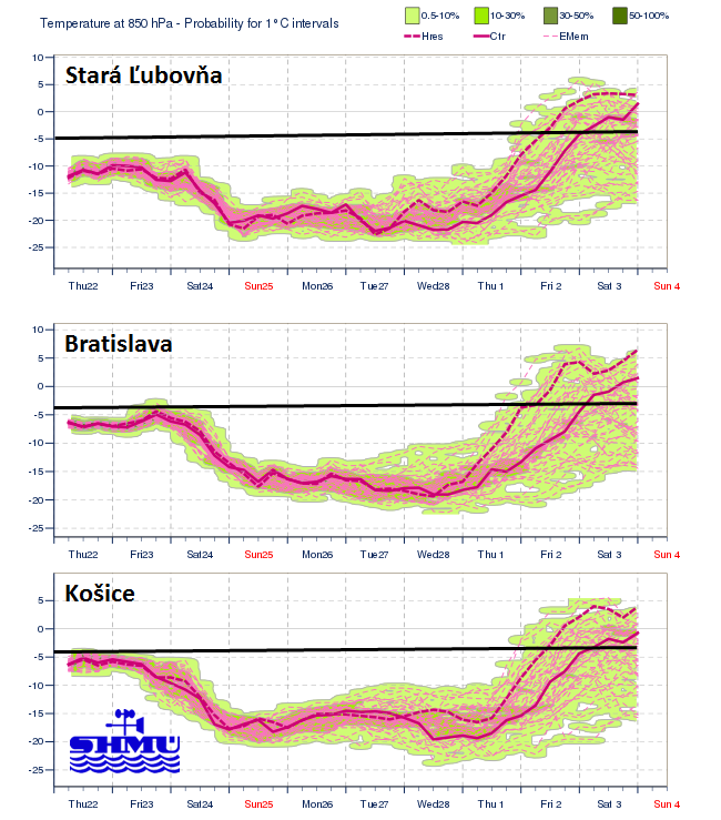 Vo štvrtok 22.2. prúdi do strednej Európy, resp. hlavne jej severnej polovice, chladný vzduch od východu po okraji tlakovej výše, ktorej stred sa v priebehu dňa presunie z Pobaltia nad rusko-ukrajinské pohraničie, kde zanikne, resp. stane sa súčasťou rozsiahlej oblasti vyššieho tlaku vzduchu siahajúcej od Kazachstanu až po Britániu a sever Európy. Súčasne však nad severom Škandinávie v studenom vzduchu začne mohutnieť výbežok tlakovej výše so stredom nad Zemou Františka Jozefa. Tento výbežok sa postupne bude rozširovať na juhozápad a po jeho okraji začne do značnej časti Európy prúdiť veľmi studený kontinentálny arktický vzduch (animácia 1). Situácia nebude len krátkodobá, pretože stred spomínanej tlakovej výše sa v pondelok 26. februára presunie z oblasti Barentsovho mora nad Škandináviu a po jej okraji sa nad Pobaltie, južnú Škandináviu a strednú Európu dostane ešte chladnejší vzduch ako cez víkend, ktorý má pôvod ďaleko na severnej Sibíri (vidieť na animácii 1). Z dnešných predpovedných materiálov sa však nezdá, že tento najchladnejší vzduch sa dostane až k nám, prenikne severne od Slovenska. U nás ostane približne rovnaká vzduchová hmota ako cez víkend. Prúdenie studeného vzduchu do strednej Európy začne v sobotu 24.2. a v našej oblasti sa udrží minimálne do 1. marca, čo vidieť na ansámblovej predpovedi teploty vzduchu v hladine 850 hPa na obr. 1, ako aj na animácii 1.