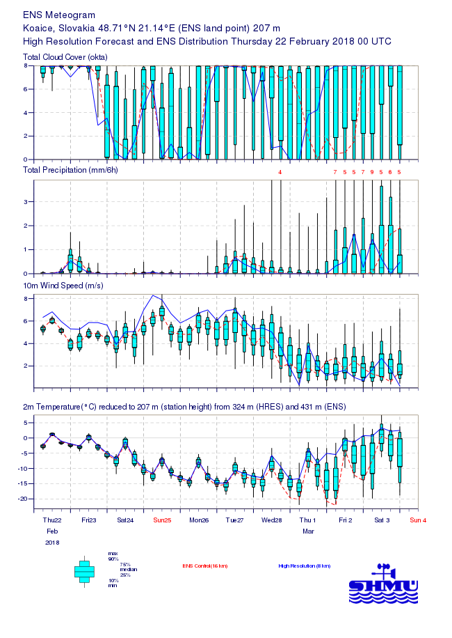 Obr. 2 Ansámblová predpoveď jednotlivých parametrov pre stanice Bratislava, Košice a Stará Ľubovňa z modelu ECMWF, od 22.2.2018 pre nasledujúcich 10 dní.