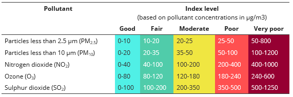 Úroveň indexu (European AQI) vyjadruje 5-škálová stupnica (kvalita ovzdušia – dobrá, uspokojivá, prijateľná, zlá, veľmi zlá) a zodpovedá najhoršej hodnote (úrovni) spomedzi všetkých meraných znečisťujúcich látok na danej stanici, pričom: