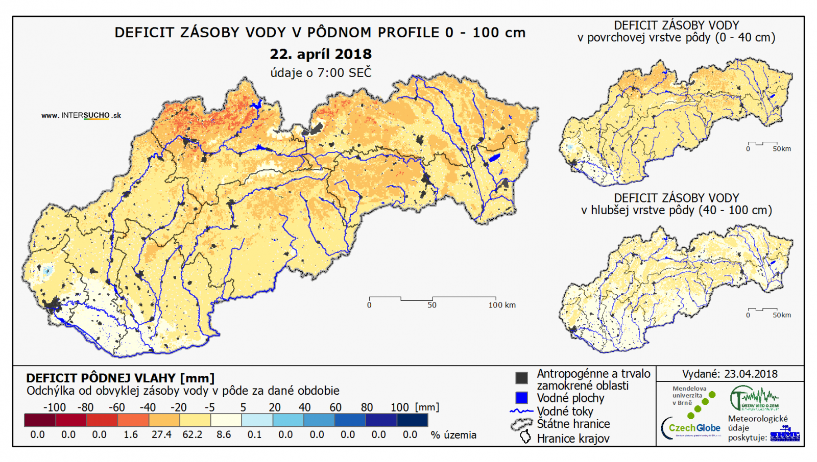 Zlé vlahové podmienky na severozápade Slovenska sa odzrkadľujú aj na intenzite pôdneho sucha, ktoré je na úrovni výrazného (S3) až extrémneho sucha (S5). Odchýlka pôdnej vlahy v tomto regióne dosahuje deficit -40 až -60 mm. Vysoký výpar sa na celom Slovensku odráža aj na poklese relatívnej vlhkosti vrchnej časti pôdneho profilu (0 – 40 cm). Na viacerých územiach Kysúc, Záhorskej, Podunajskej a Východoslovenskej nížiny, ale aj Košickej kotliny je nasýtenie pôdy v tejto vrstve pod 50 % (= pod bodom zníženej dostupnosti).