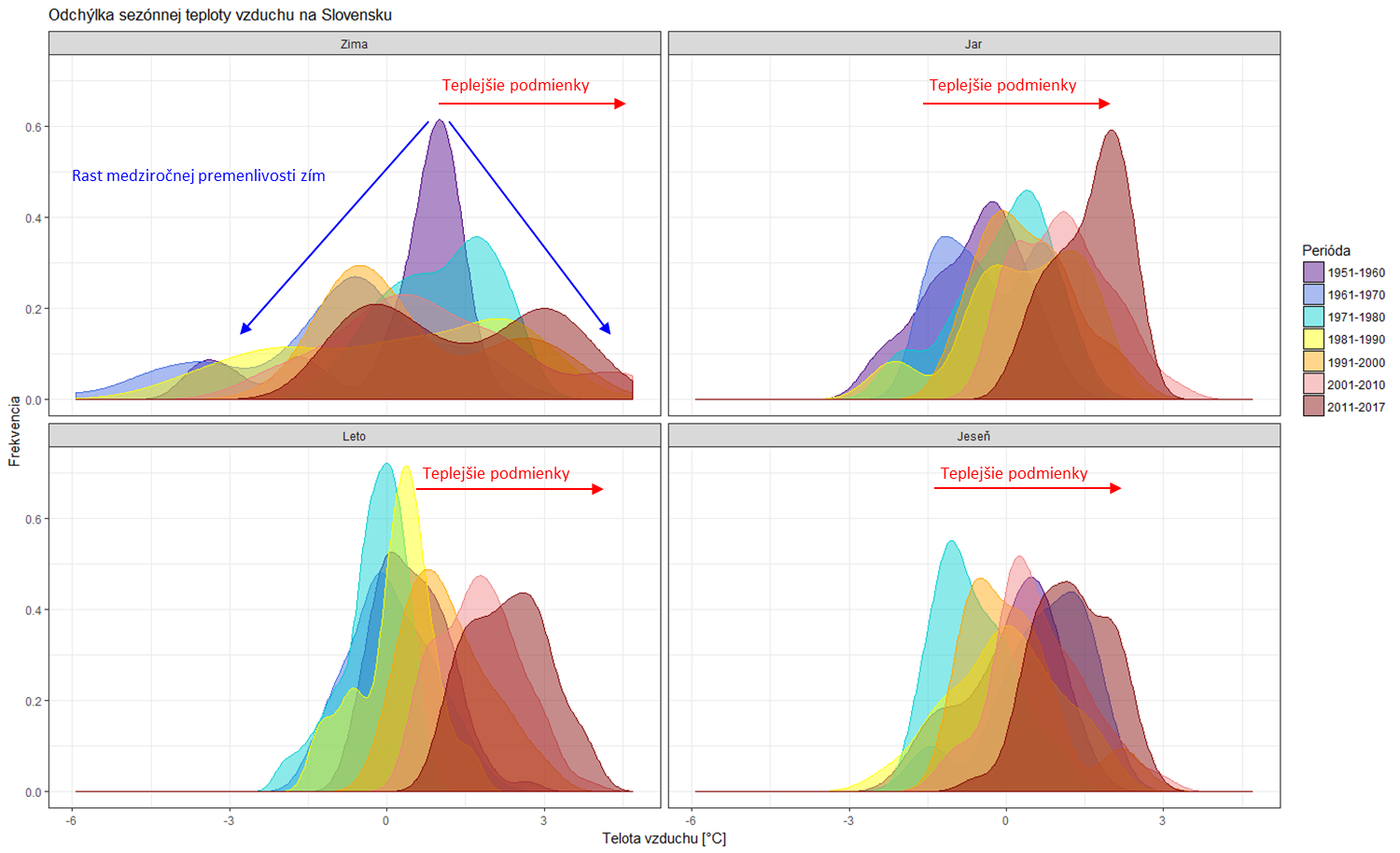 Tento vývoj pravdepodobne má bezprostredný súvis s častejším výskytom teplotne nadnormálnych letných sezón (najmä od začiatku 90. rokov 20. storočia - priložený obrázok znázorňuje zmenu distribúcie odchýlok priemernej sezónnej teploty vzduchu na Slovensku v období 1951-2018 - obr. v prílohe) a významnými zmenami charakteru počasia v druhej polovici augusta a v priebehu septembra, ktoré v podmienkach vyššej teploty prinášajú v priemere vyššie úhrny a intenzívnejšie zrážky. [Výdatnosť atmosférických zrážok na Slovensku sa zvyšuje.] Uvedený trend sa začína prejavovať aj v dlhodobom raste priestorových úhrnov atm. zrážok v septembri aspoň od roku 1951 [priložený obr.: Územný úhrn atmosférických zrážok za september na Slovensku v období 1881-2017; tridsaťročné priemery sú zvýraznené modrými horizontálnymi čiarami.] V tejto súvislosti treba nakoniec zdôrazniť aj to, že intenzívne zrážky z 1. a 2. septembra vypadávali pri nadnormálne vysokých denných aj nočných teplotách (+2 až +5 °C v porovnaní s normálom 1961-1990).