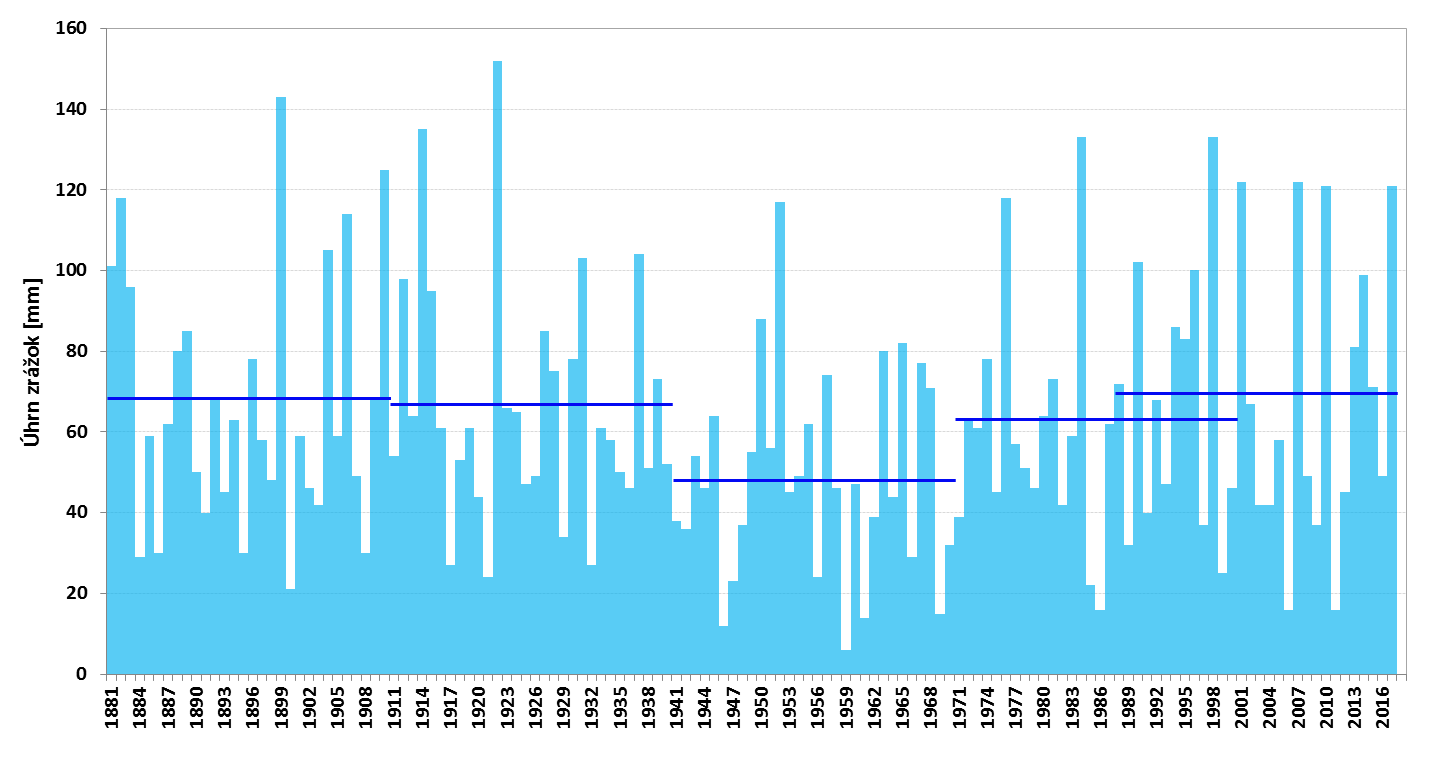 Ako možno vidieť aj z Tab. 3, sumárne spadlo za obdobie od 31.8.2018 do 4.9.2018 na mnohých miestach západného Slovenska (najmä v regióne Malých a Bielych Karpát, na strednom Považí a na Záhorí, Obr. 1) aj viac ako 100 mm zrážok. Na meteorologických staniciach v Jaslovských Bohunice a v Smolenie (Obr. 6) to bolo dokonca až 160, resp. 161 mm, čo je množstvo ekvivalentné štvor-, resp. trojnásobku priemerného mesačného úhrnu zrážok v septembri (v porovnaní s normálom 1961-1990; Obr. 3). V prípade oboch staníc ide súčasne aj o vôbec najvyššiu 5-dennú sumu zrážok za rok aspoň od roku 1951, čo je v prípade septembra veľmi pozoruhodné. Ako sme už informovali aj v predošlých analýzach a napr. v zhodnotení stavu klímy na Slovensku v roku 2017, dlhodobý rast úhrnov zrážok v priebehu septembra v posledných približne 30 rokoch je významne rýchlejší ako v iných mesiacoch roka [Zhodnotenie roka 2017].