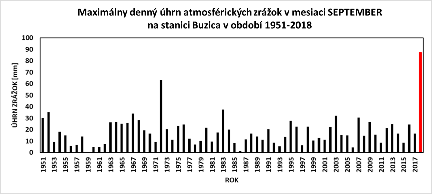 Obr. 4: Maximálny septembrový denný úhrn atmosférických zrážok na zrážkomernej stanici Buzica v období 1951-2018.[Zdroj: SHMÚ]