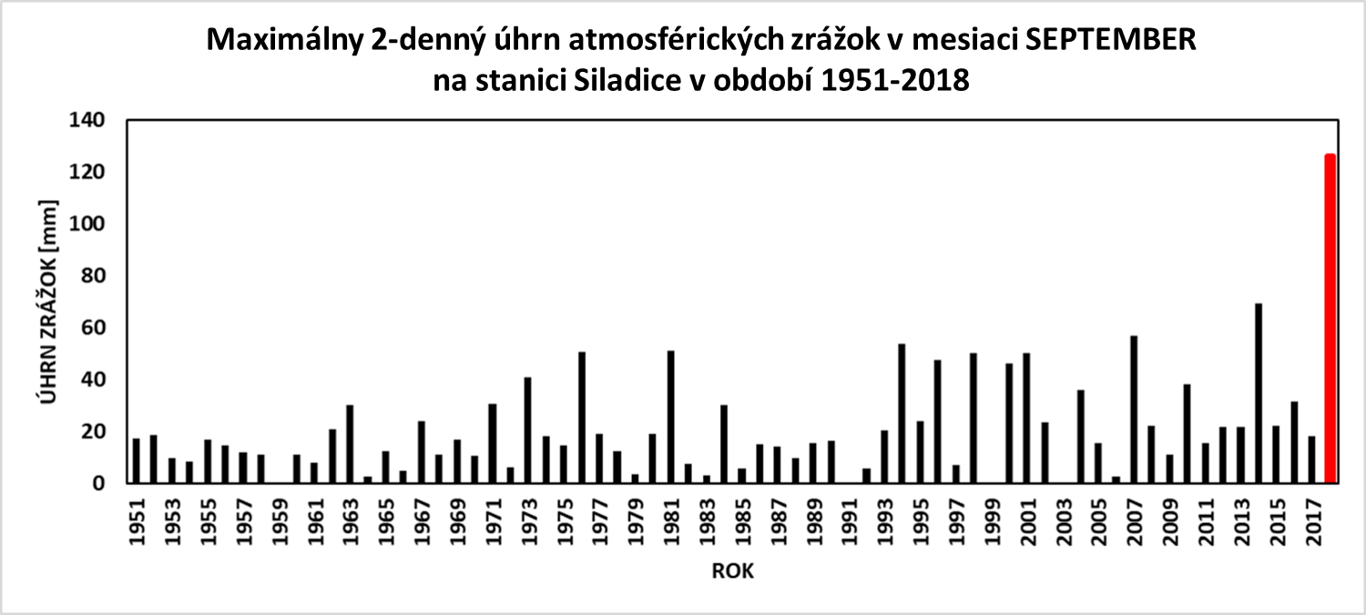 Obr. 5: Maximálna septembrová suma 2-denných úhrnov atmosférických zrážok na zrážkomernej stanici Siladice v období 1951-2018 [Zdroj: SHMÚ]