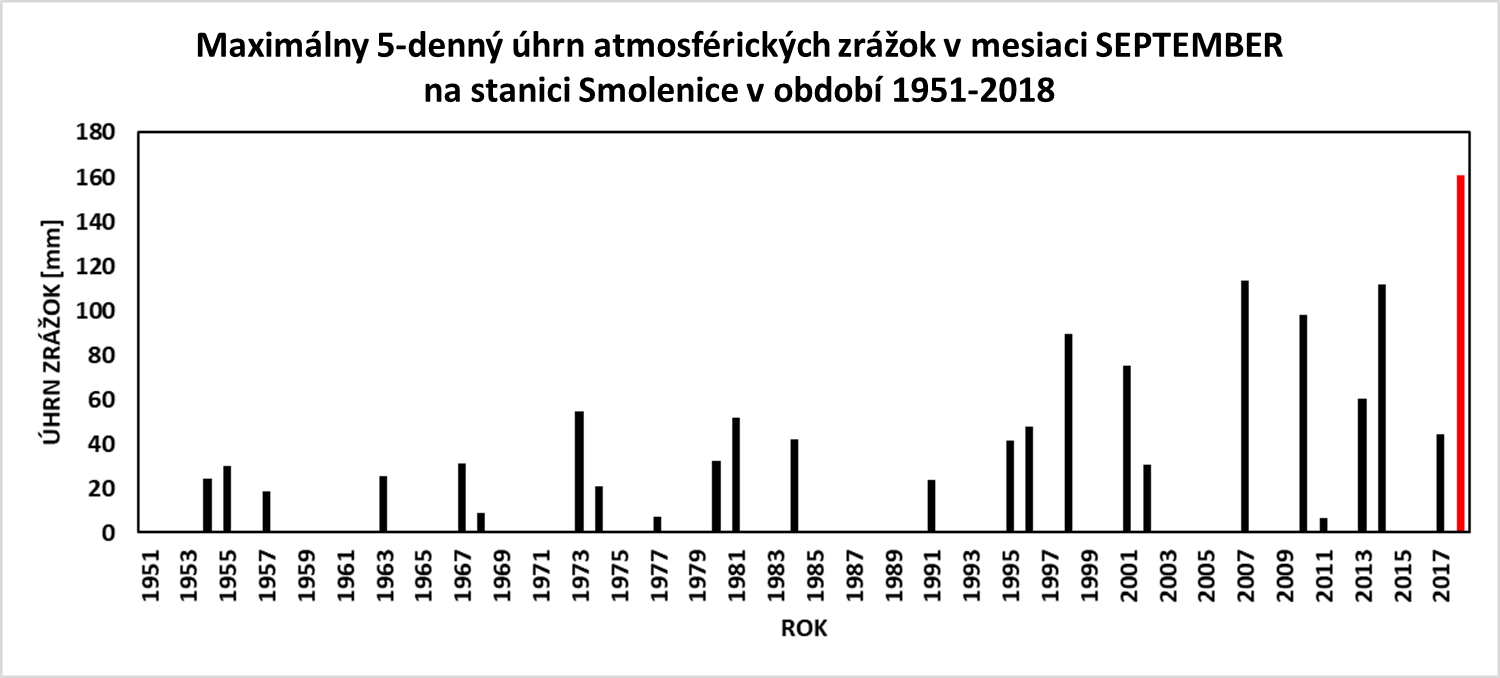Obr. 6: Maximálna septembrová suma 5-denných úhrnov atmosférických zrážok na zrážkomernej stanici Smolenice v období 1951-2018 [Zdroj: SHMÚ]