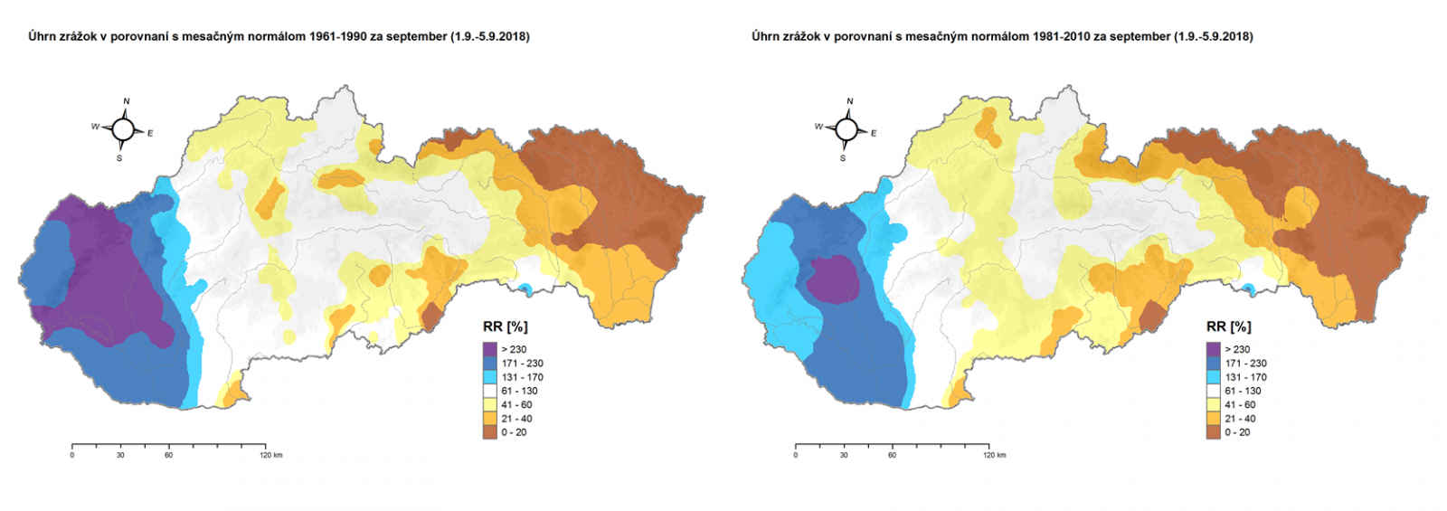 Obr. 3: Suma denného úhrnu atmosférických zrážok za obdobie od 1.9. do 5.9.2018 v porovnaní s mesačným úhrnom zrážok za september v normálovom období 1961-1990 a 1981-2010 [Zdroj: SHMÚ]