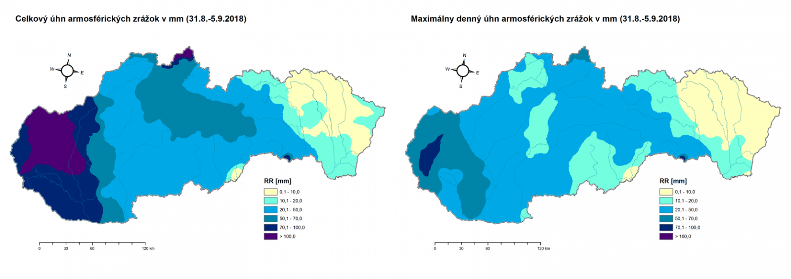 Obr. 1: Suma denného úhrnu atmosférických zrážok za obdobie od 31.8. do 5.9.2018 (vľavo) a maximálny denný úhrn zrážok za rovnaké obdobie (vpravo) na Slovensku na základe operatívnych údajov SHMÚ z automatických meteorologických (AMS) a zrážkomerných staníc (AZS) [Zdroj: SHMÚ]