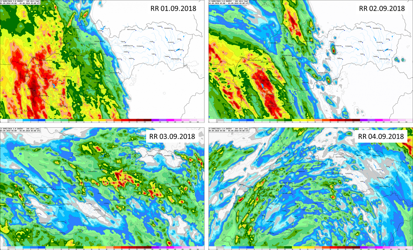 Obr. 2: Denný úhrn atmosférických zrážok v mm/24h na území Slovenska v období od 1. do 4. 9. 2018 (denný úhrn v čase od 7.00 do 7.00 hod LSEČ) na základe údajov systému INCA SHMÚ; úhrn zrážok za 1. 9. 2018 (vľavo hore), 2. 9. 2018 (vpravo hore), 3. 9. 2018 (vľavo dole), 4. 9. 2018 (vpravo dole) [Zdroj: SHMÚ]