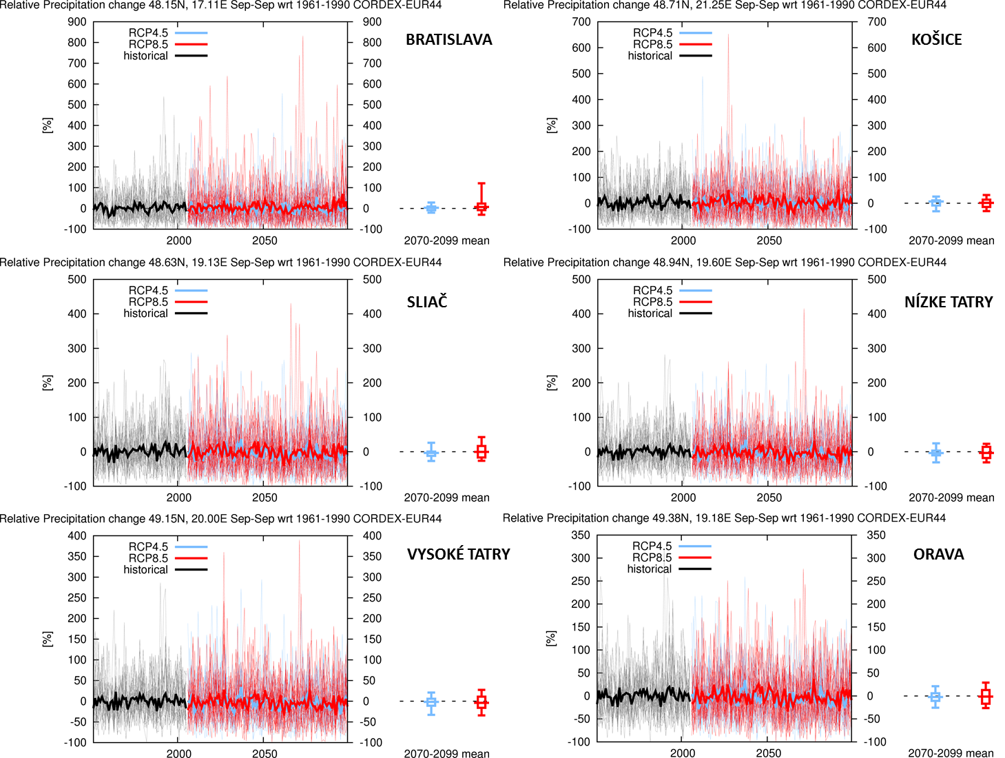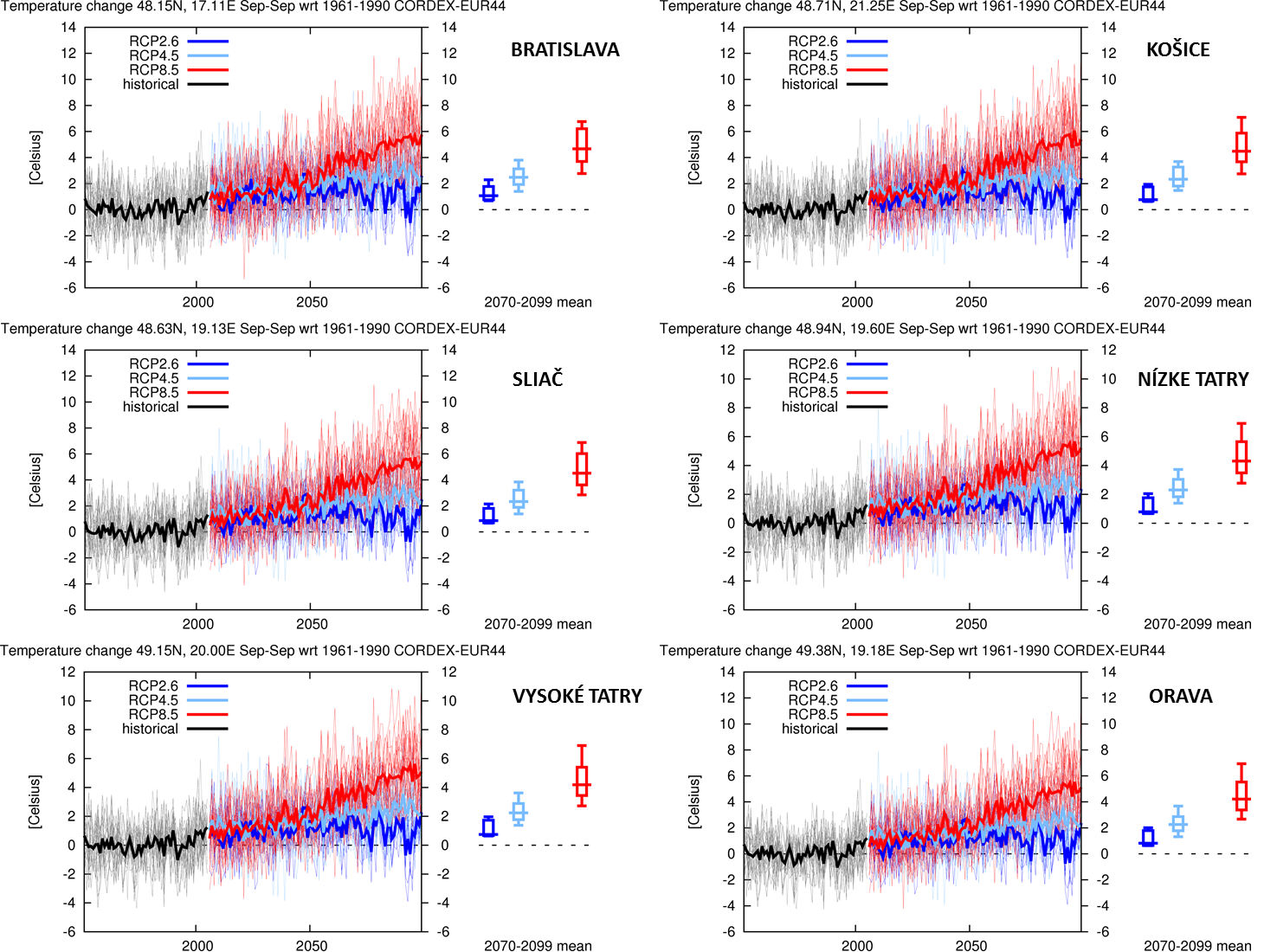 Aj keď dlhodobé zmeny (rast) priemernej mesačnej teploty vzduchu v septembri v jetnotlivých regiónoch Slovenska sú v porovnaní napr. s letnými mesiacmi (jún-august) reatívnej "pomalšie" - v septembri ide o rast priemernej mesačnej T o približne 0,5 až 1,0 °C (v letných mesiacoch aj o viac ako 2,0 °C) - na základe výstupov regionálnych klimatických modelov (RCMs) v rámci ensemblu CORDEX-EUR44 (Obr. 9) je možné očakávať v nasledujúcich dekádach 21. storočia postupné zvyšovanie priemernej teploty vzduchu v septembri v rozsahu od 2,0 do 5,0 °C (v závislosti od emisného scenára; na Obr. 9 sú porovnané zmeny T pre emisné scenáre RCP2.6 - nízky scenár, RCP4.5 - stredný scenár a RCP8.5 - vysoký scenár) v porovnaní s normálom 1961-1990. Pre uvedené scenáre T sme pripravili scenáre očakávaných zmien priemerného mesačného úhrnu zrážok v septembri pre vybrané regióny (Bratislava, Košice, Sliač, Nízke a Vysoké Tatry, a Orava).