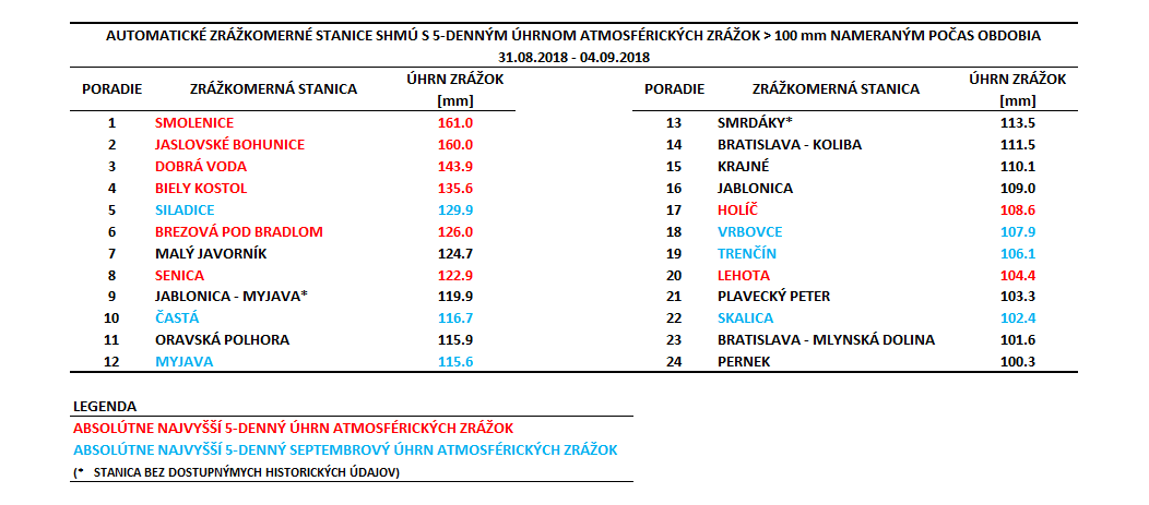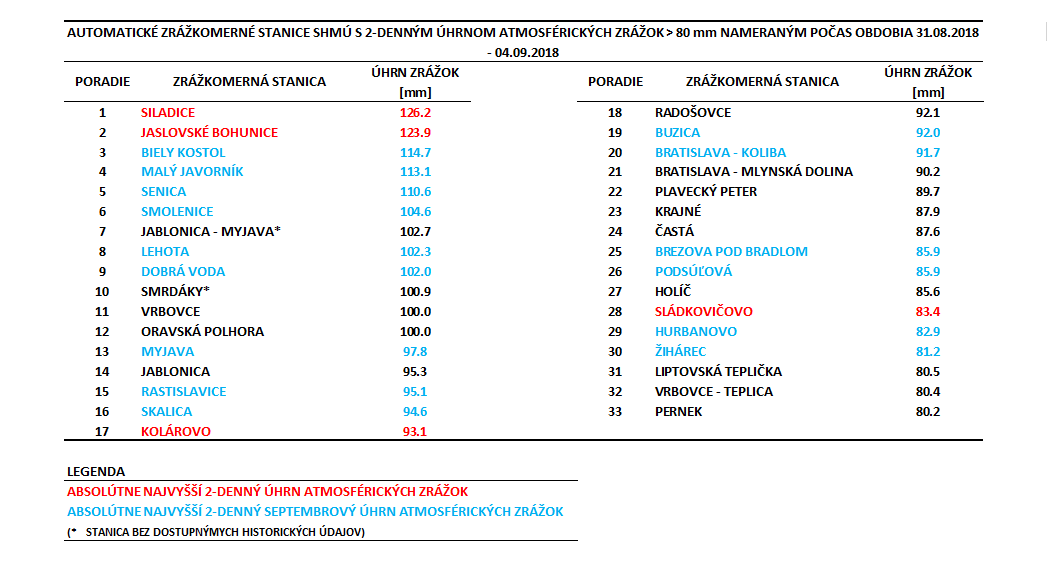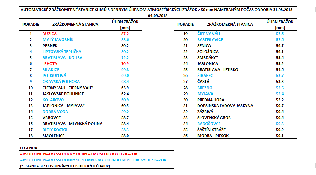 Tab. 1: Denný úhrnu atmosférických zrážok RR>50 mm, za obdobie od 31.8. do 5.9.2018 na základe operatívnych údajov SHMÚ z automatických meteorologických (AMS) a zrážkomerných staníc (AZS) [Zdroj: SHMÚ]