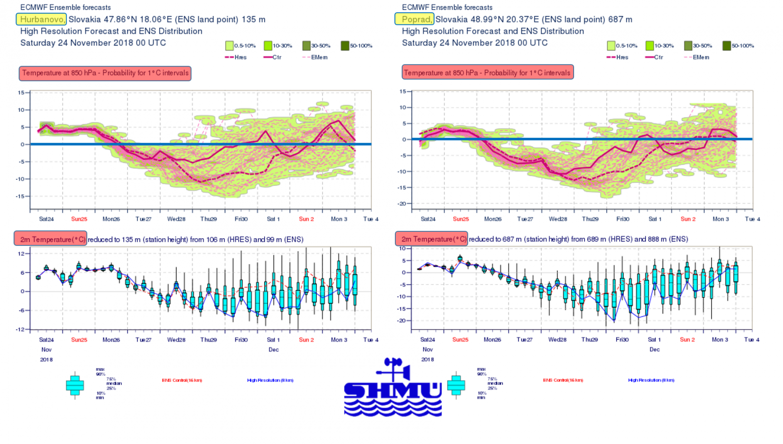 Na priloženej animácii (nižšie) môžete vidieť vývoj teploty vzduchu v hladine 850 hPa (cca 1400 – 1500 m n. m.) a prízemného tlakového poľa od soboty (24. novembra) až do piatka (30. novembra). V prvých dňoch predpovede sa v našej oblasti bude ešte nachádzať teplý a vlhký vzduch, ktorý k nám bude prúdiť po prednej strane tlakovej níže presúvajúcej sa z Biskajského zálivu až nad centrálne Stredomorie. Spomínaná tlaková níž sa bude v ďalších dňoch presúvať ďalej na severovýchod a súčasne v oblasti Škandinávie a Pobaltia zmohutnie tlaková výš. Po prednej strane tejto tlakovej výše k nám začne už v pondelok (26. novembra) prúdiť veľmi chladný vzduch od severovýchodu. V ďalších dňoch sa v našej oblasti bude aj naďalej nachádzať chladný vzduch, avšak jeho prílev postupne zoslabne, keďže spomínaná tlaková výš sa bude rýchlo presúvať ďalej na východ. Teplota vzduchu v hladine 850 hPa postupne klesne až na hodnoty okolo -10 °C, a to nielen v oblasti severného, ale aj juhozápadného Slovenska. Potvrdzuje to aj ansámblová predpoveď modelu ECMWF pre tieto lokality (obr. 1). Ochladenie sa samozrejme bude týkať nielen vysokých a stredných polôh, ale postupne ho pocítime aj v nižších polohách.