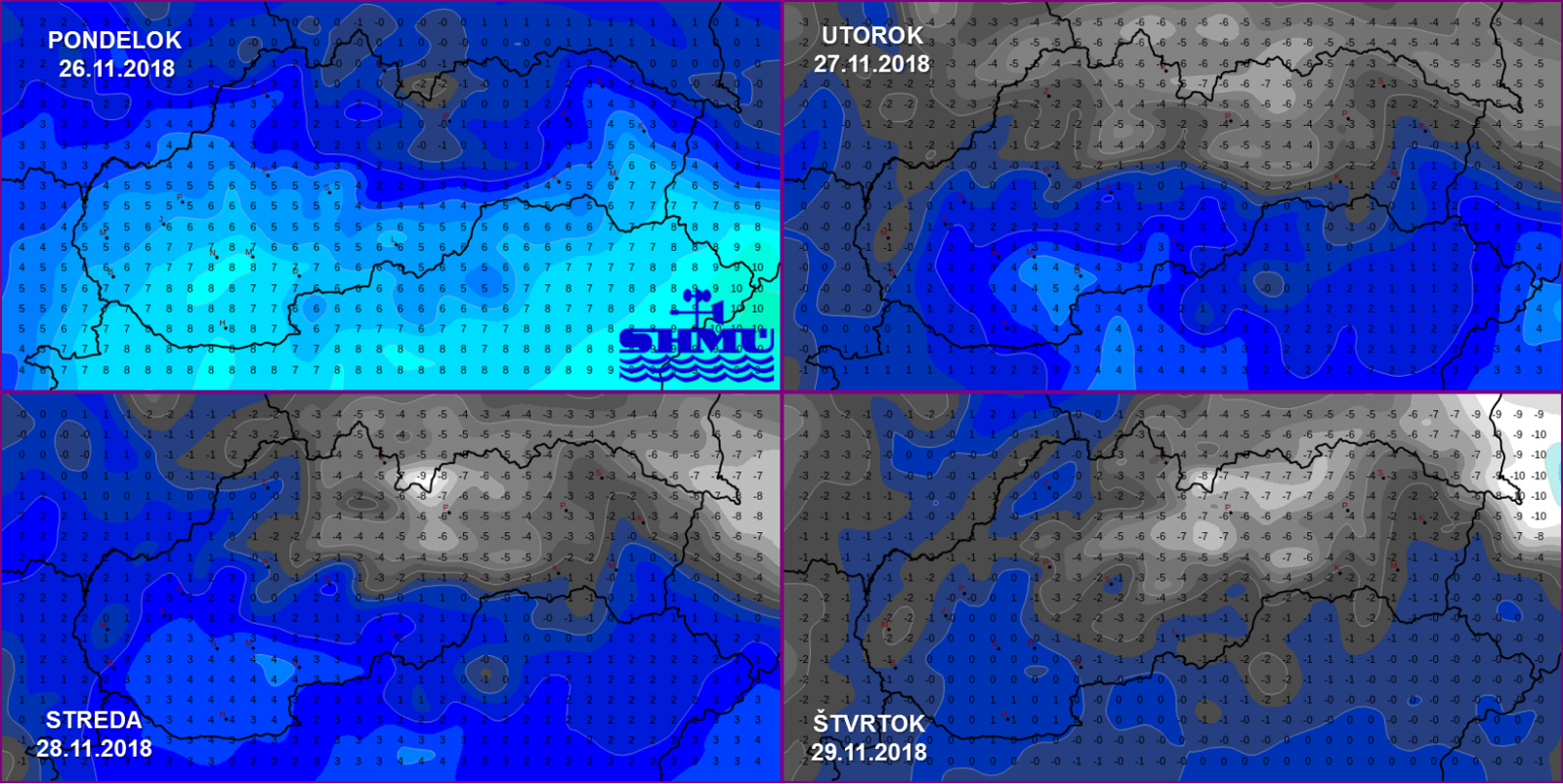 V strede budúceho týždňa očakávame výrazný pokles nočnej teploty vzduchu, vyskytnú sa aj celodenné mrazy. Počas najchladnejších dní vystúpi na juhu územia teplota vzduchu len slabo nad nulu, na severe bude maximum teploty len okolo -5 st (obr. 1). V noci bude postupne na celom našom území mrznúť, v dolinách a kotlinách môže teplota vzduchu klesnúť až na hodnoty okolo -15 st.