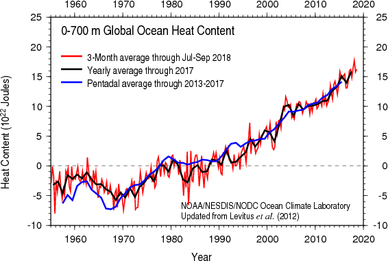 Viac ako 90 % tepla generovaného zosilneným skleníkových efektom atmosféry je absorbované oceánmi. Dlhodobý vývoj tepelného obsahu oceánov (Ocean Heat Content – OHC), predovšetkým v horných 700, resp. 2000 metroch vodného stĺpca oceánov, patrí medzi najkonzervatívnejšie a najkonzistentnejšie indikátory prebiehajúceho otepľovania, resp. klimatickej zmeny (hodnoty OHC majú len minimálnu časovú premenlivosť). Trojmesačné priemery OHC v období od januára do septembra 2018 boli v úrovni do 700, resp. 2000 metrov rekordne vysoké, prípadne druhé najvyššie od roku 1955, resp. 2005 (najvyššie po roku 2017).