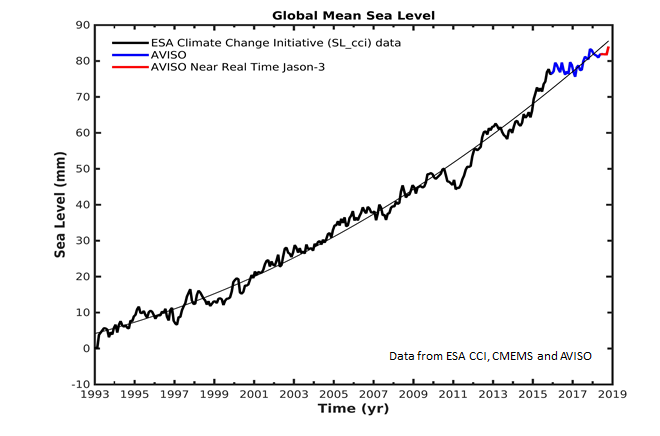 Globálne údaje o úrovni [priemernej] hladiny svetových oceánov (GMSL, Obr. 3), dostupné do konca októbra 2018, naznačujú, že v období od januára do júla 2018 GMSL bola o 2 až 3 mm vyššia ako v porovnateľnom období v roku 2017. GMSL tak ostáva na veľmi vysokej úrovni (+8 cm v porovnaní s obdobím v roku 1993) po tom, ako medzi obdobím 2014-2016 (v dôsledku javu El Niño) vzrástla jej hodnota o takmer 2 cm.