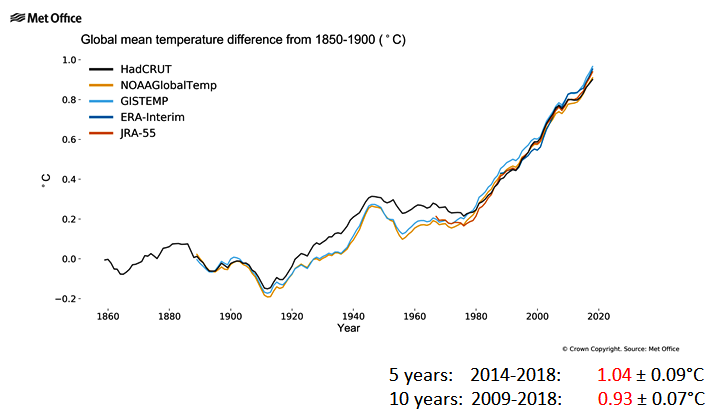 Obr. 2: Odchýlka globálnej teploty (od priemeru za obdobie 1850-1900; 5-ročné priemery) v období rokov 1850-2018 podľa údajov piatich databáz (NASA, NOAA, CRU, JMA a ECMWF) [Zdroj: WMO]
