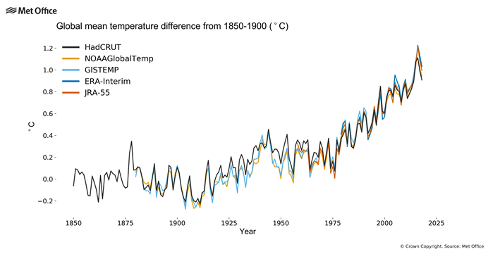Obr. 1: Odchýlka globálnej teploty (od priemeru za obdobie 1850-1900) v období rokov 1850-2018 podľa údajov piatich databáz (NASA, NOAA, CRU, JMA a ECMWF) [Zdroj: WMO]