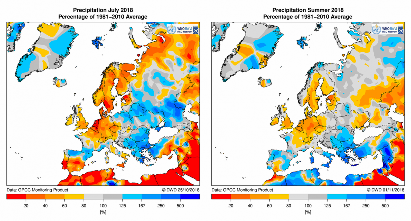 Mimoriadne až extrémne teplotne nadnormálne podmienky (Obr. 4), sprevádzané aj závažným suchom, zasiahli v závere jari a v priebehu leta 2018 rozsiahle oblasti Európy (predovšetkým juhozápadnú, západnú a severnú Európu, vrátane Britských ostrovov). V priebehu júla a augusta zaznamenali mimoriadne vysoké denné teploty vzduchu aj v oblastiach za severným polárnym kruhom (predovšetkým vo Fínsku). Dlhodobo suché podmienky s výrazným zrážkových deficitom (Obr. 5) pretrvávali v priebehu teplého polroka 2018 najmä v Nemecku, Českej republike, Dánsku, v západnom Poľsku, Holandsku, Belgicku a niektorých oblastiach Francúzska. Pretrvávajúce sucho v niektorých krajinách západnej Európy viedlo k veľkým stratám na úrode. Napríklad v Nemecku klesli tohtoročné výnosy kukurice až o 43 % a zemiakov o 21 %.