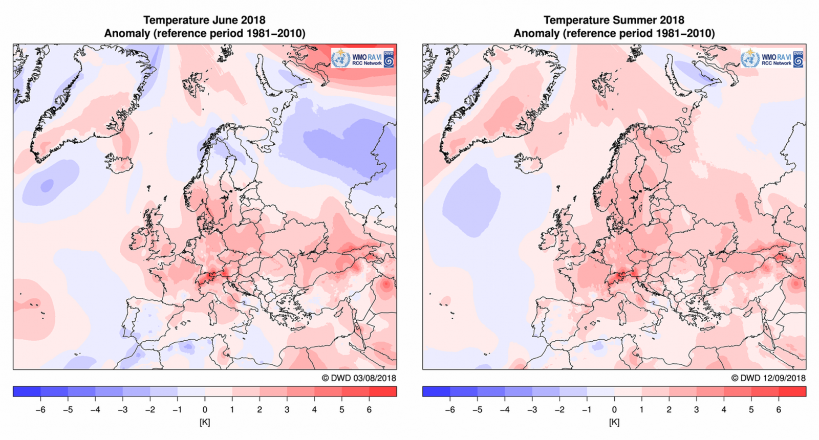 Obr. 4: Odchýlka priemernej teploty vzduchu v Európe v júni a v lete 2018 na základe údajov WMO a DWD; porovnanie s normálom 1981-2010 [Zdroj: DWD]