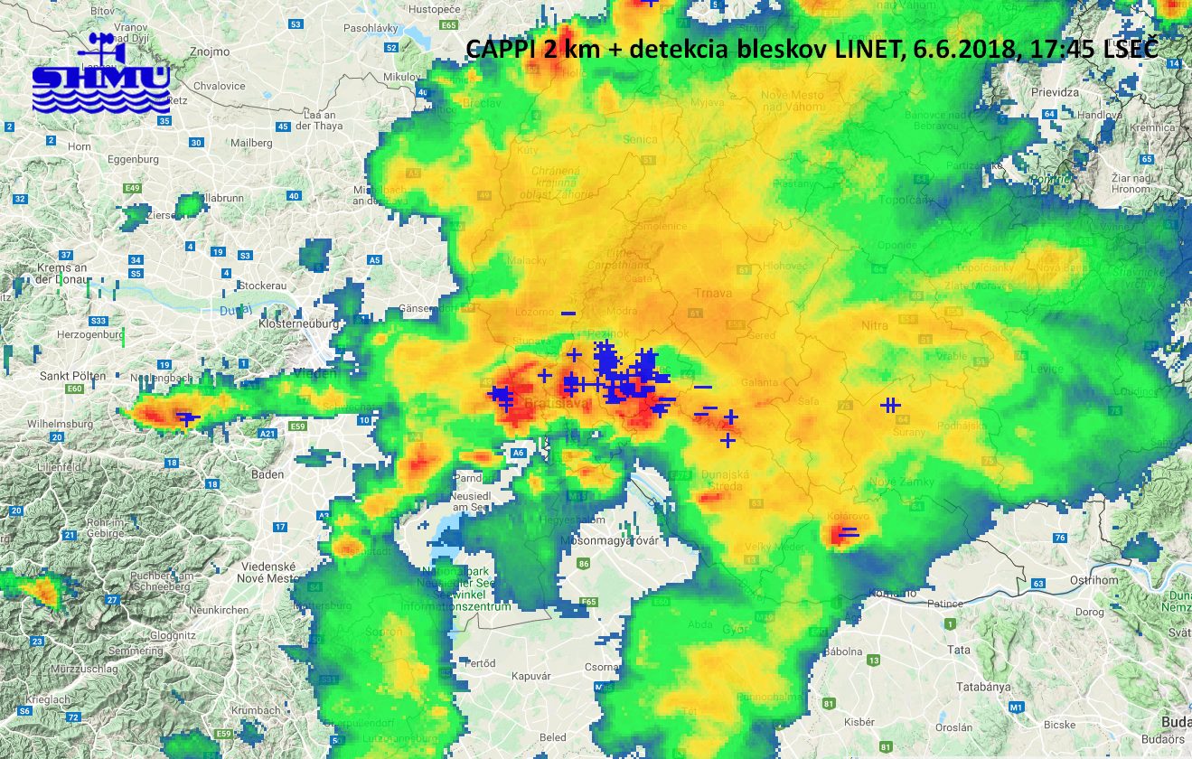 Jedna zaujímavá situácia sa vyskytla ešte na začiatku júna. Konkrétne v stredu, 6. júna 2018, sa v Bratislave, ale aj v ďalších oblastiach na juhozápadnom Slovensku v popoludňajších až podvečerných hodinách vyskytli intenzívne konvektívne zrážky (obr. 1), ktorých následkom bolo zatopenie viacerých miestnych komunikácií (obr. 2). Za 24 hodín spadlo napríklad v Bratislave na Kolibe 53,8 mm zrážok, v Bratislave na letisku 44,4 mm a v Čunove 55,7 mm. Veľa zrážok spadlo aj v Žihárci (60,5 mm) alebo v Jakubove na Záhorí (65,5 mm).