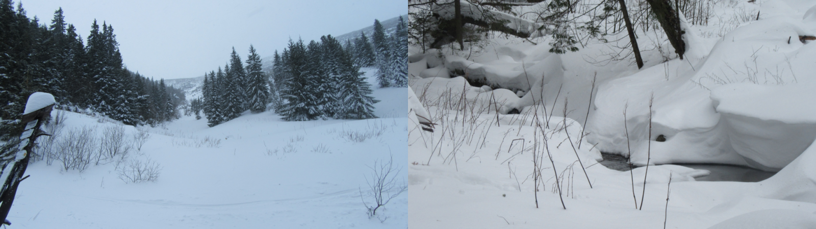 Obr. 6: Na ceste k Jaskyni mŕtvych netopierov – vľavo (cca 1400 m n. m.) a záveje nad Trangoškou – vpravo (cca 1200 m n. m.) dňa 27.12.2018