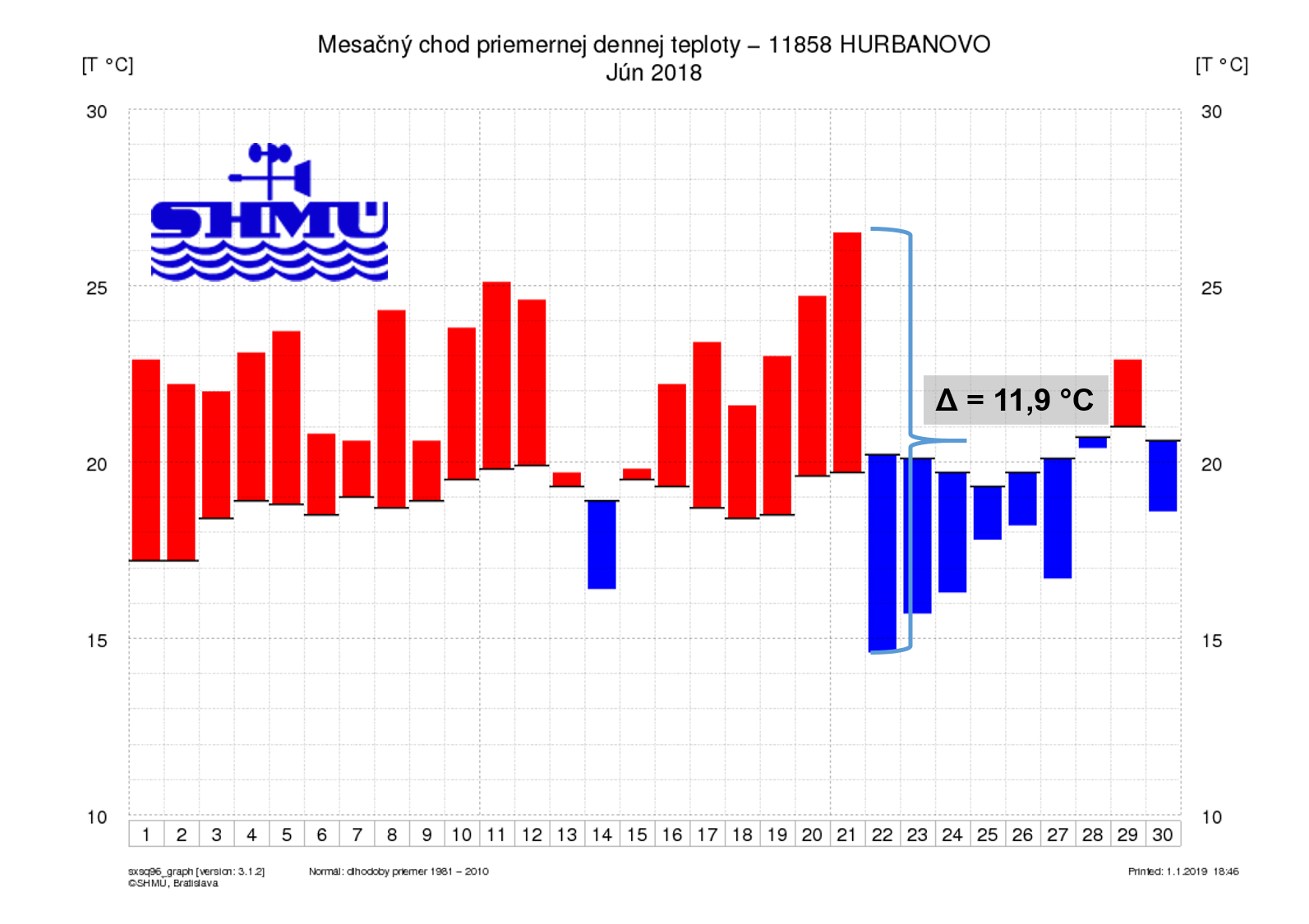 Aj napriek tomu, že počas leta 2018 takmer úplne absentovali obdobia s dlhšie trvajúcim chladnejším počasím, predsa len sa vyskytlo jedno zaujímavé ochladenie, a síce v Hurbanove sme z 21. na 22. júna 2018 zaznamenali pokles priemernej dennej teploty vzduchu o 11,9 °C. Bol to na tejto stanici 3. najväčší medzidňový pokles priemernej dennej teploty vzduchu aspoň od roku 1951.