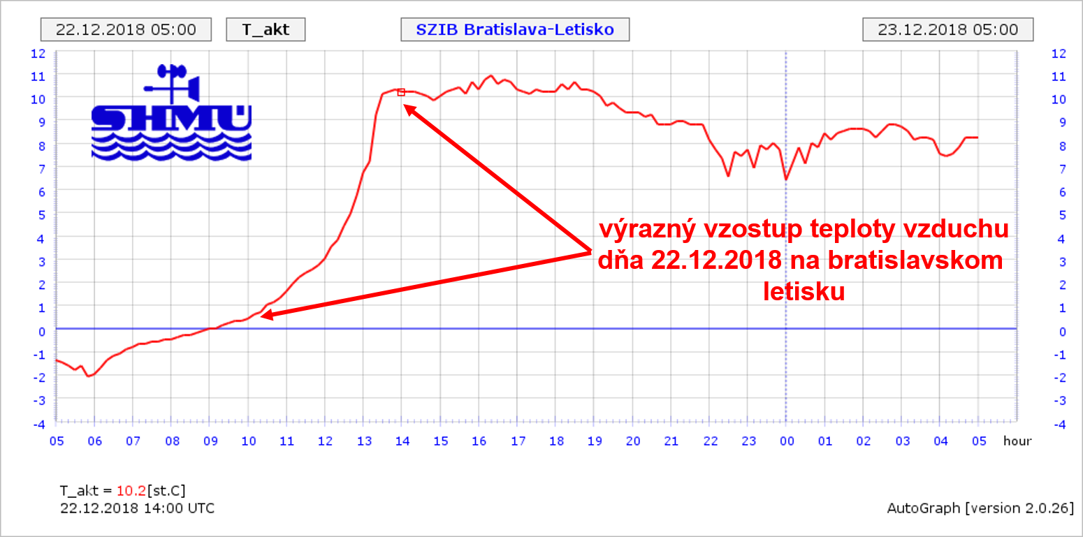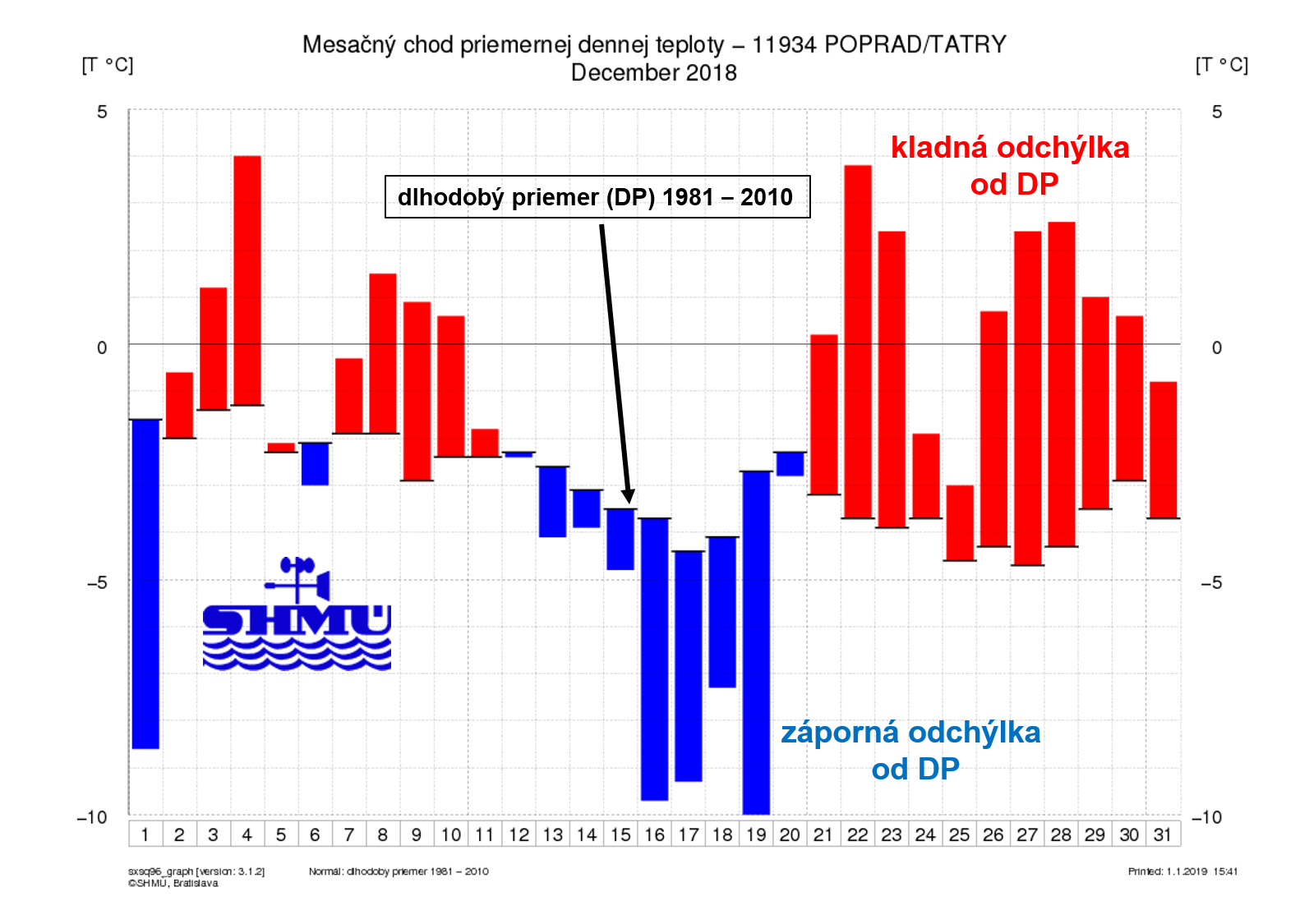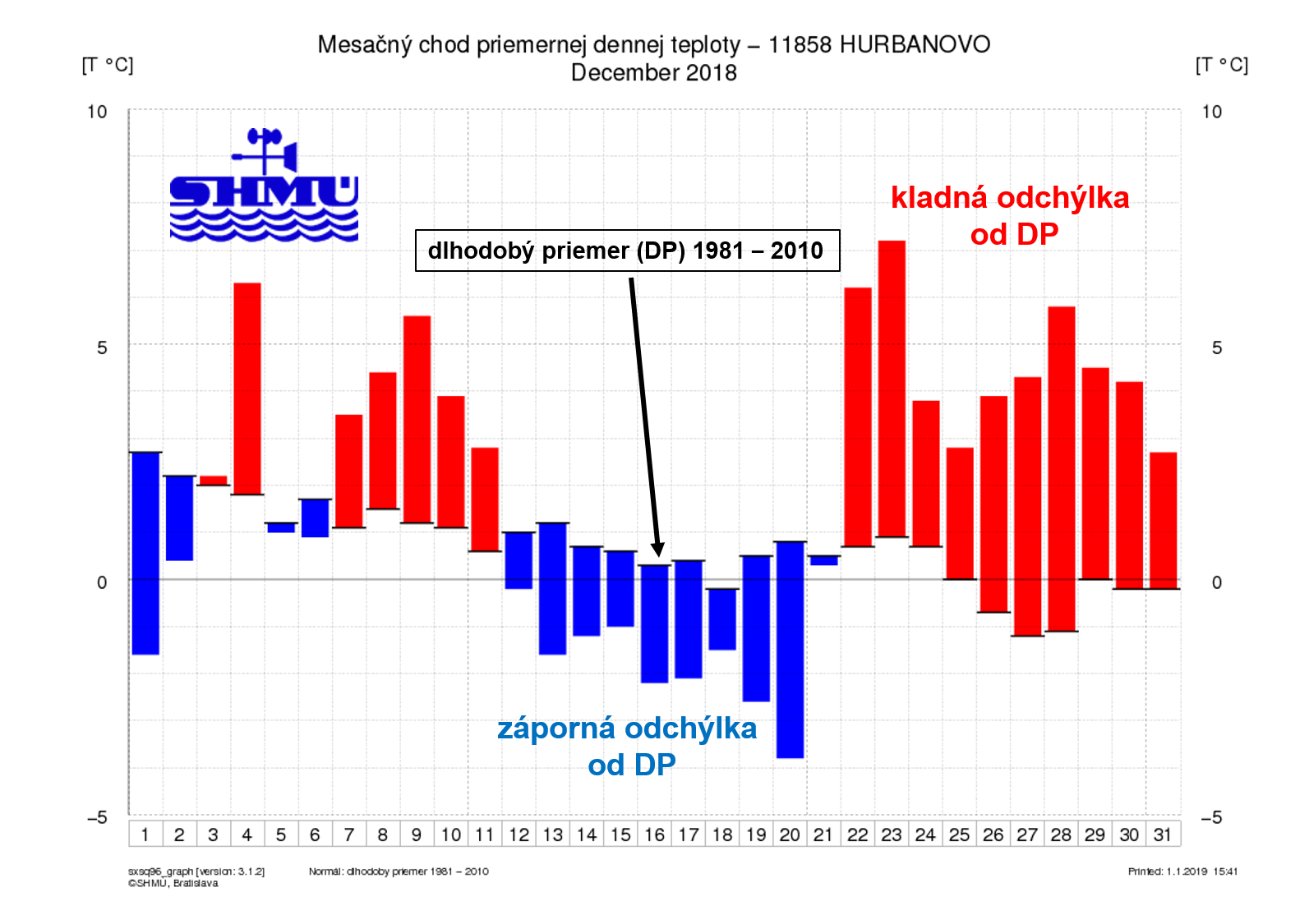 Záver roka 2018 sa na území Slovenska vyznačoval teplým počasím. Ešte 20.12. bolo mrazivo, väčšinou aj so snehovou pokrývkou a maximálna denná teplota vzduchu nevystúpila na väčšine územia ani nad nulu. O dva dni neskôr (22.12.) sa už predovšetkým na juhozápade Slovenska začalo výrazne otepľovať. Napríklad v Bratislave na letisku bolo dňa 22.12.2018 maximum teploty vzduchu až 11,4 °C, v Kuchyni na Záhorí bolo 10,5 °C a podobné maximá boli aj 23.12. V niektorých lokalitách na juhozápade Slovenska sa v závere roka dokonca vyskytlo súvislé obdobie, keď teplota vzduchu aj niekoľko dní, dokonca ani v noci, neklesla pod bod mrazu. Napríklad na bratislavskom letisku a v Kráľovej pri Senci nemrzlo od 23.12. až takmer do úplného záveru roka. Na stanici v Hurbanove a v Žihárci začalo toto obdobie bez mrazu už 22.12. Na juhozápade Slovenska sme tak zaznamenali bezmála 9, respektíve 10 dňové obdobie, kedy teplota vzduchu nepoklesla pod nulu. Na väčšine územia západného Slovenska, vrátane už spomínaných lokalít, mrzlo až počas silvestrovskej noci, teda z 31.12.2018 na 1.1.2019. Nie je teda prekvapivé, že v období od 22. do 31.12. bola priemerná denná teplota vzduchu výrazne nad dlhodobým priemerom (pozri napríklad chod priemernej dennej teploty vzduchu v decemberi na staniciach v Hurbanove, v Poprade a na košickom letisku) a v posledný deň roka 2018 sa v polohách do 300 – 400 m n. m. nenachádzala v nižších polohách na západnom Slovensku žiadna súvislá snehová pokrývka. Sneh sa v tejto časti Slovenska vyskytoval len v horských oblastiach zhruba od nadmorskej výšky 700 m n. m. V iných častiach Slovenska (stred a východ krajiny) bola situácia o niečo lepšia, samozrejme aj tu bolo výrazne viac snehu v stredných (obr. 6) a vysokých polohách, ojedinele však aj v nižších polohách (obr. 7).