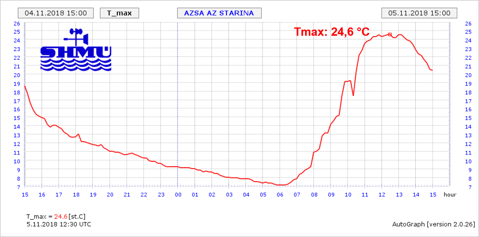 Spomenieme ešte veľmi teplý záver októbra a začiatok novembra 2018. Dňa 29.10. sa v Hurbanove teplota vzduchu ,,vyšplhala" až na 24,1 °C, čo je hodnota cca 11 °C nad dlhodobým priemerom maxím poslednej októbrovej pentády. Táto hodnota tiež prekonala dovtedy platný rekord maximálnej dennej teploty vzduchu pre 29.10. zo Žihárca, ktorý mal hodnotu 23,2 °C. Teplota vzduchu však vystupovala nad 20 °C ešte aj na začiatku novembra a dňa 4.11. sme v Prievidzi namerali maximum až 23,9 °C. Ešte teplejšie bolo na krajnom východe Slovenska v Orechovej, až 24,2 °C. O deň neskôr sme takmer zaznamenali prvý novembrový letný deň na našom území. Na stanici, ktorú máme umiestnenú pri vodnej nádrži Starina (obr. 5) na krajnom východe Slovenska, sa oteplilo až na 24,6 °C. Táto hodnota je doteraz najvyššou novembrovou teplotou vzduchu od začiatku meraní na území Slovenska.