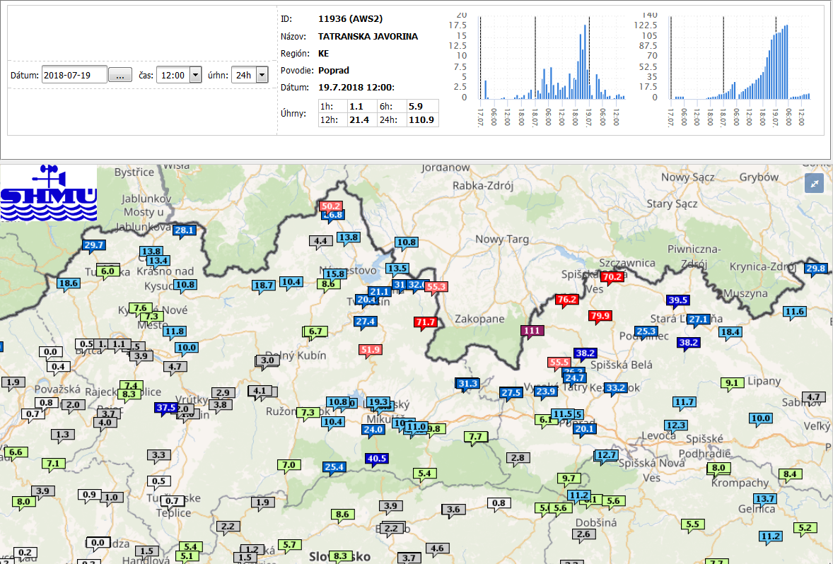 V závere druhej júlovej dekády sa intenzívne zrážky vyskytli v tatranskej oblasti. Za dva dni spadli v náveterných polohách Oravy a Tatier veľmi vysoké úhrny zrážok (obr. 3). Bolo to spôsobené vplyvom tlakovej níže so stredom nad ukrajinsko-ruským pohraničím, pričom nad naše územie prúdil po jej zadnej strane od severu vlhký vzduch, v ktorom sa vytvárali trvalé zrážky. Najvyšší úhrn sme zaznamenali v obci Tatranská Javorina, kde za 48 hodín (do 19.7.2018 do 12-tej hodiny) spadlo až 163,2 mm zrážok. Viac ako 100 mm sme však zaznamenali aj v iných lokalitách: Skalnaté Pleso 123,9 mm, Oravská Polhora 113,7 mm, Oravice 108,5 mm, Reľov 104,6 mm, Osturňa 103,3 mm, Suchá Hora 98 mm, Červený Kláštor 95,2 mm. Zrážky vypadávali v silnom severnom prúdení, preto hory výrazne modifikovali ich úhrny, najviac ich spadlo na severnom návetrí, najmenej v závetrí v južnej časti pohoria. Takto vysoké úhrny lokálne spôsobili veľké problémy – vybreženie riek, zaplavenie pivníc, domov, dvorov, ale aj zničenie ciest (obr. 4) a strhnutie viacerých mostov.