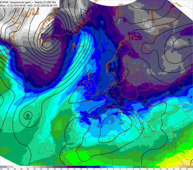 Vpád studeného, pôvodom arktického, vzduchu do našej oblasti na prelome februára a marca 2018 (teplota vzduchu v hladine 850 hPa (cca 1500 m n. m.), analýza modelu ECMWF).