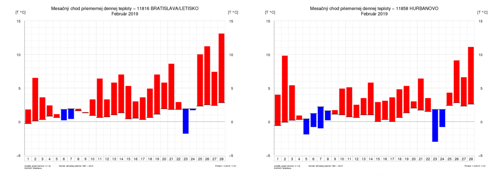 Február 2019 bol na území Slovenska teplotne nadnormálny. Na juhozápadnom Slovensku a na východnom Slovensku, na mnohých meteorologických staniciach, ale napríklad aj v Oravskej Lesnej a na niektorých tatranských meteorologických staniciach, dosiahla odchýlka priemernej mesačnej teploty vzduchu od normálu 1981-2010, v tomto poslednom mesiaci zimy, +3,0 °C a viac, takže na týchto miestach bol február 2019 teplotne silne nadnormálny. Jedny z najvyšších hodnôt týchto odchýlok boli zaznamenané v Kuchyni na letisku a na Lomnickom štíte (+3,6 °C). Ak by sme porovnávali priemernú mesačnú teplotu vzduchu v tohtoročnom februári s dlhodobým priemerom 1961-1990, tak odchýlky by boli ešte väčšie a na meteorologickej stanici Bratislava-Koliba by to bolo až +4,0 °C. [Odchýlka priemernej dennej teploty vzduchu v Bratislave na letisku a v Hurbanove vo februári 2019 od normálu 1981-2010.]