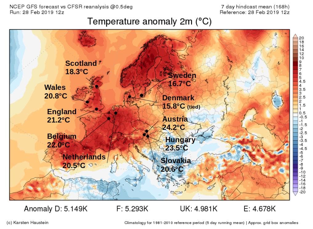 Meteorologická zima 2018/2019 (december 2018 - február 2019) sa s nami rozlúčila skutočne veľmi neštandardne, keď posledný februárový deň priniesol najvyššiu teplotu vzduchu zaznamenanú v priebehu zimy v celej histórii novodobých meteorologických meraní a pozorovaní na území Slovenska. V priebehu včerajšieho dňa (28. február 2019) sme totiž hneď na dvoch meteorologických staniciach, v Žihárci a Hurbanove, zaznamenali absolútne najvyššiu maximálnu dennú teplotu vzduchu vo februári a v zime, a to 20,6 °C. Bola tak prekonaná najvyššia teplota vzduchu v priebehu zimy, ktorú sme zaznamenali 22. februára 2016 na meteorologickej stanici Bratislava-letisko (20,3 °C). Okrem Slovenska, mimoriadne až extrémne teplo bolo v priebehu včerajšieho dňa aj v celej rozsiahlej oblasti západnej, strednej a dokonca severnej Európy.
