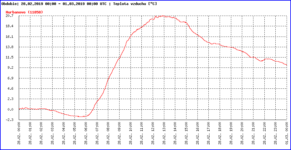 Včerajšie oteplenie bolo mimoriadne aj z hľadiska svojej rýchlosti. Napríklad, vzostup teploty vzduchu z rannej minimálnej teploty v Hurbanove (-1,9 °C) na denné maximum (20,6 °C) – s dennou amplitúdou 22,5 °C – bol vo februári na tejto meteorologickej stanici vôbec najrýchlejší od roku 1901 (ak berieme do úvahy podmienky bez prítomnosti snehovej pokrývky na zemskom povrchu). Priestorové rozloženie teploty vzduchu na Slovensku dňa 28. februára 2019 o 10:00 h a maximálnej teploty vzduchu za posledných 12 hodín k 16:00 h SEČ je zobrazené na Obr. 2. [Vývoj teploty vzduchu na meteorologickej stanici Hurbanovo dňa 28. februára 2019 podľa údajov z AWS.]