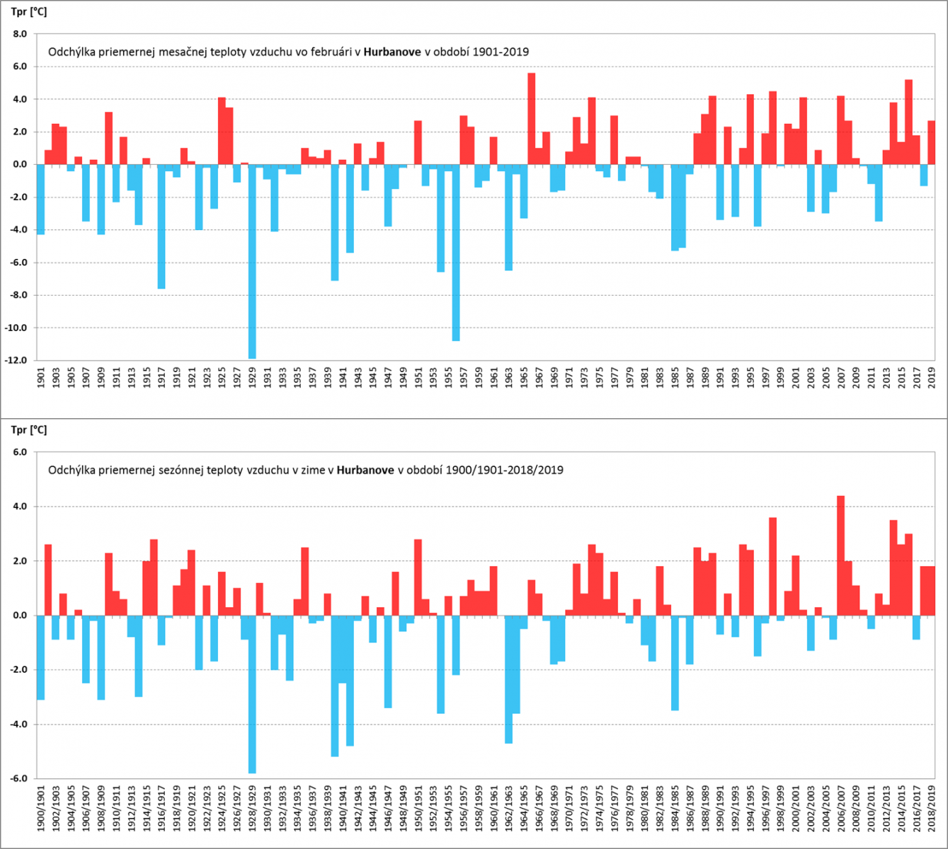 Obr. 3: Odchýlka priemernej mesačnej (február; hore) a sezónnej teploty vzduchu (zima; dole) na meteorologickej stanici Hurbanovo v období 1900 až 2019 (v porovnaní s normálom 1961-1990) [Zdroj: SHMÚ]